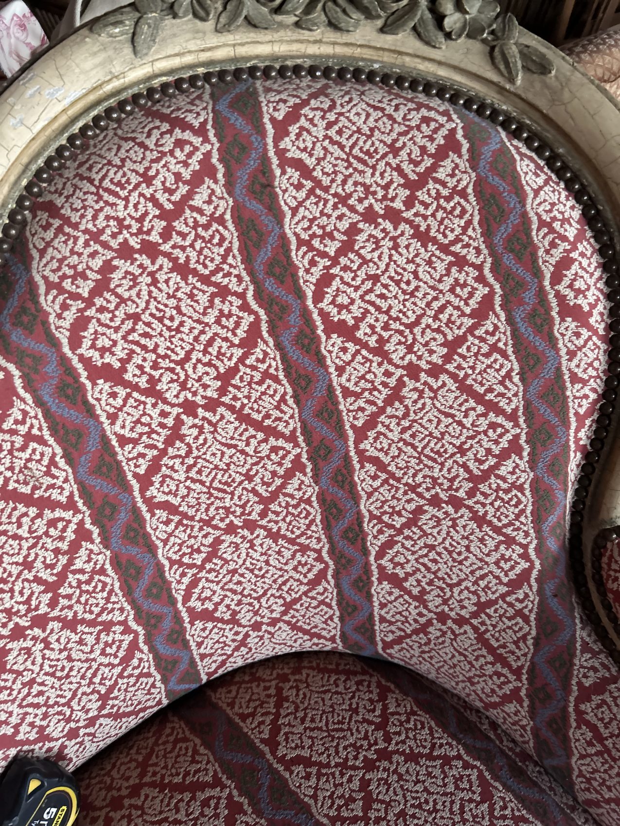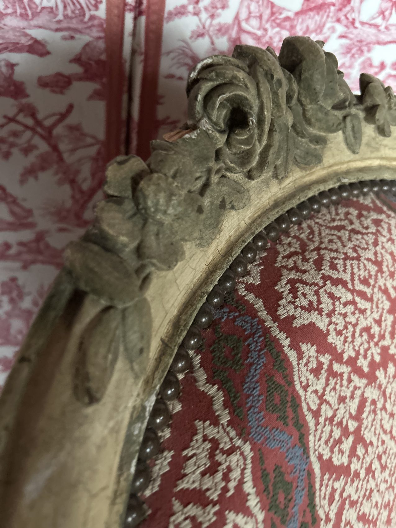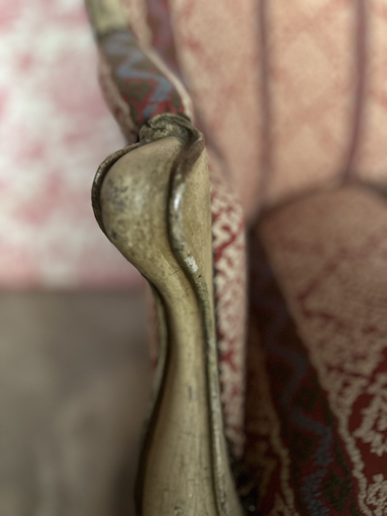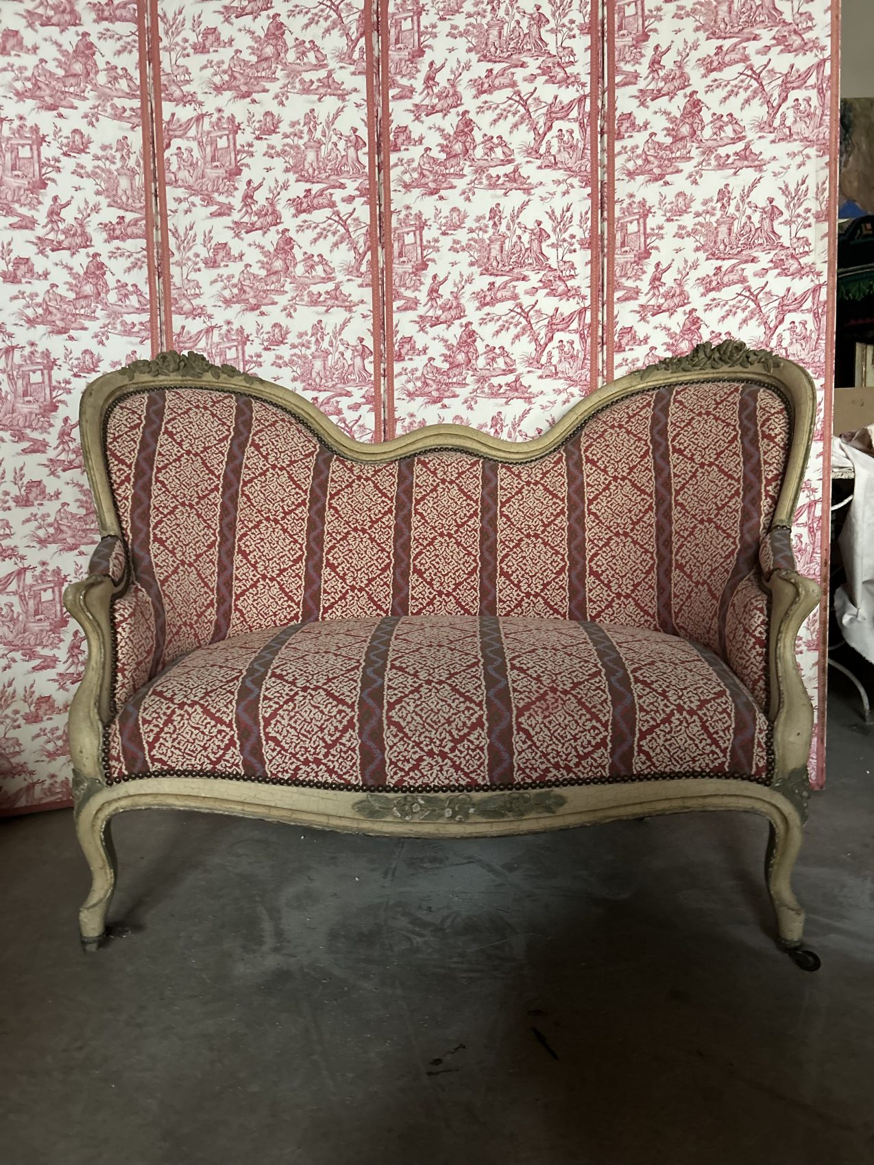 Le bois est patiné blanc, une finition qui met en valeur les sculptures et apporte une douceur visuelle très appréciée, le réfection du tissu et de l’assise date elle du XXe siècle.
