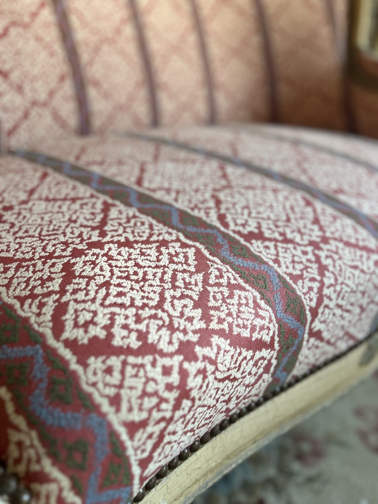 Cette banquette est donc de style Louis XV, mais fabriquée à l’époque Napoléon III, ce qui explique son équilibre entre élégance et solidité.