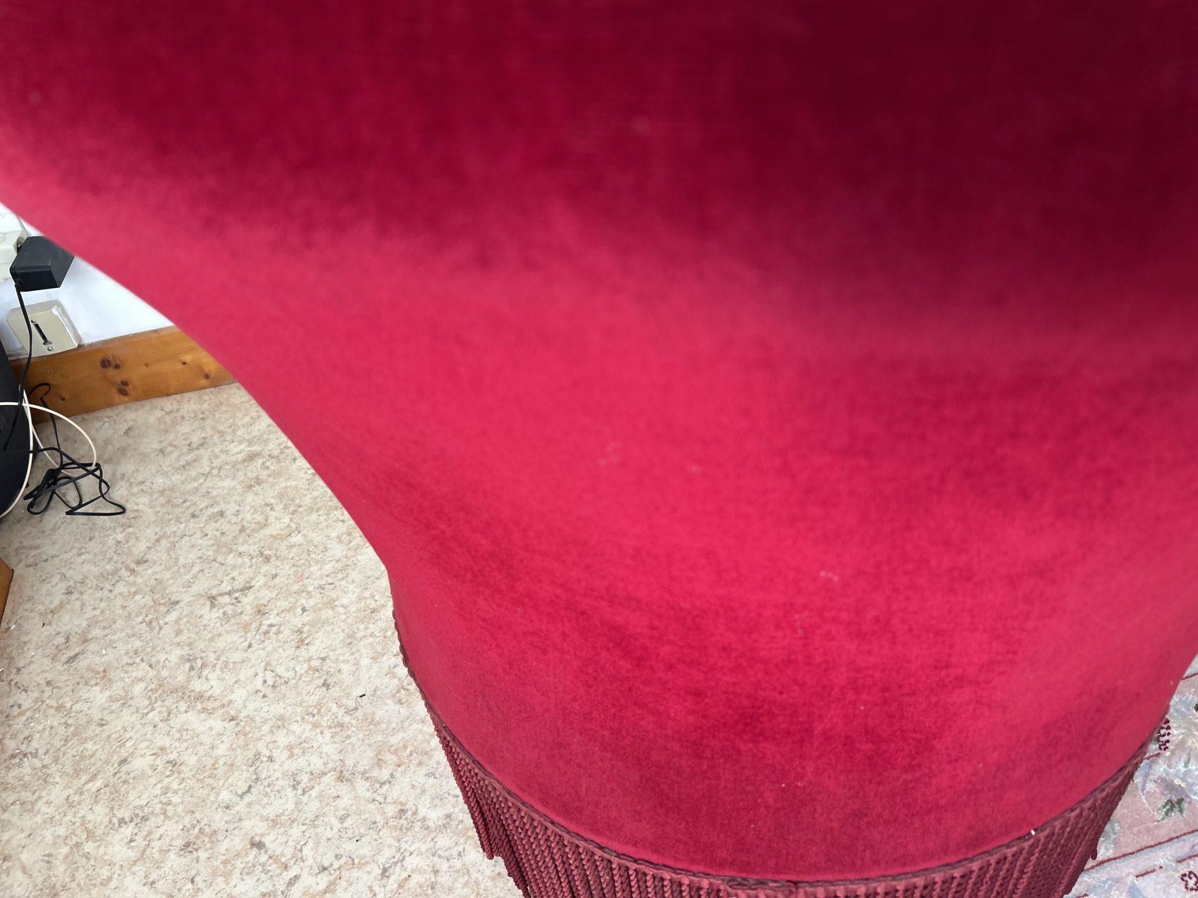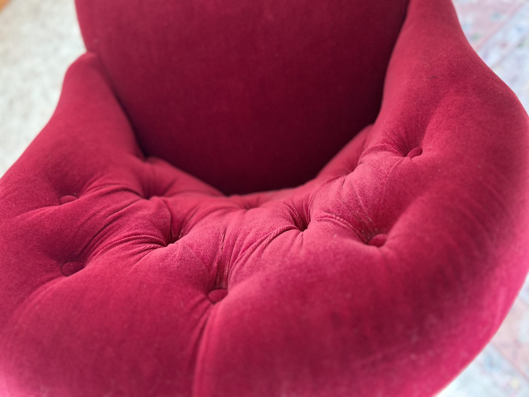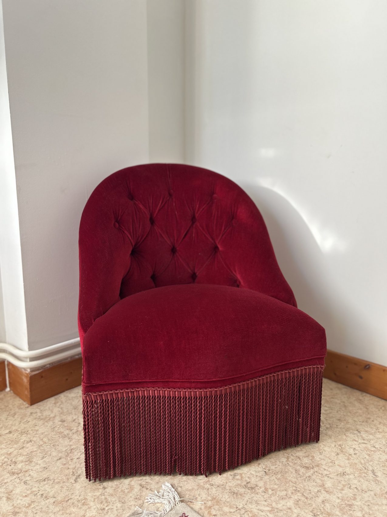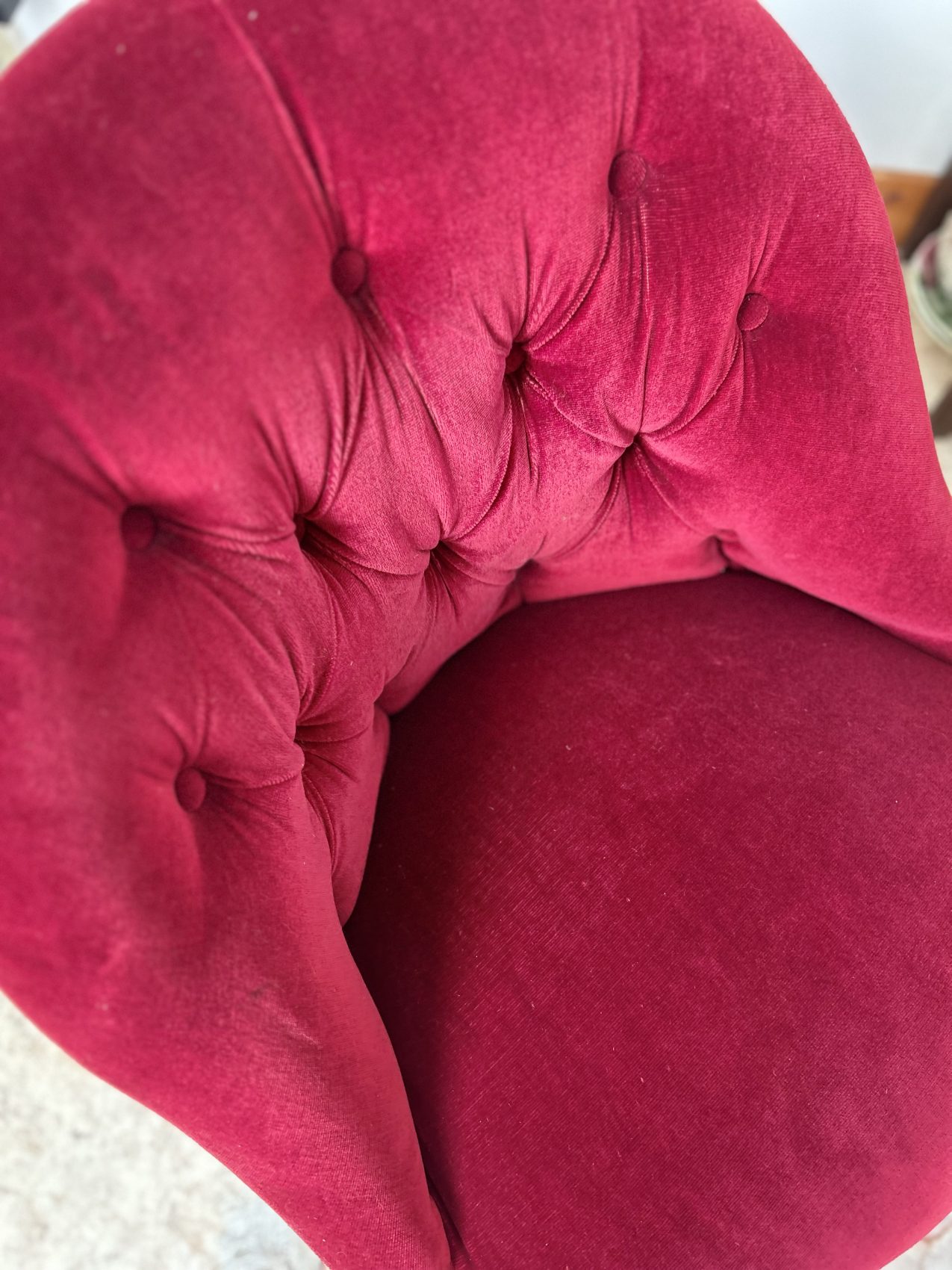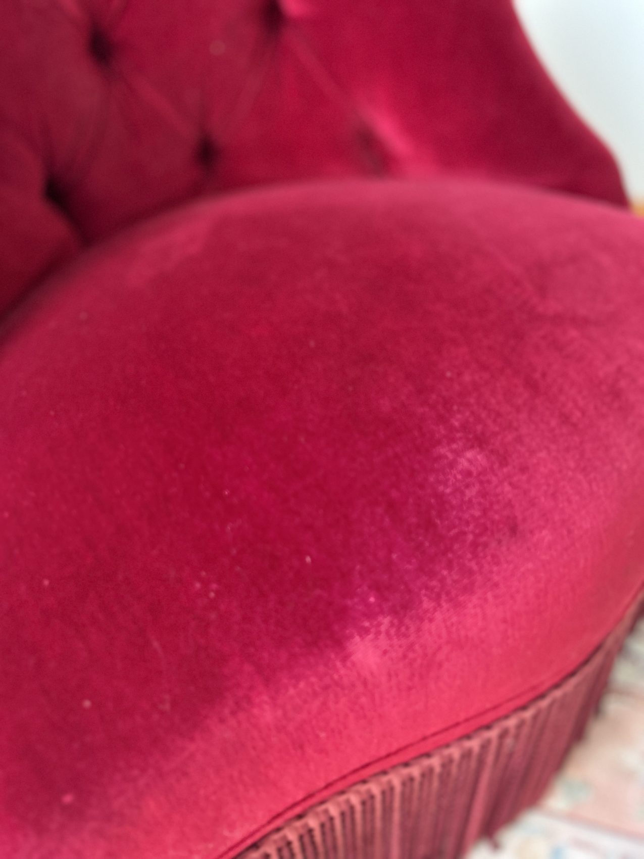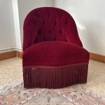 Fauteuil crapaud en velours bordeaux – capitonné- charme intemporel