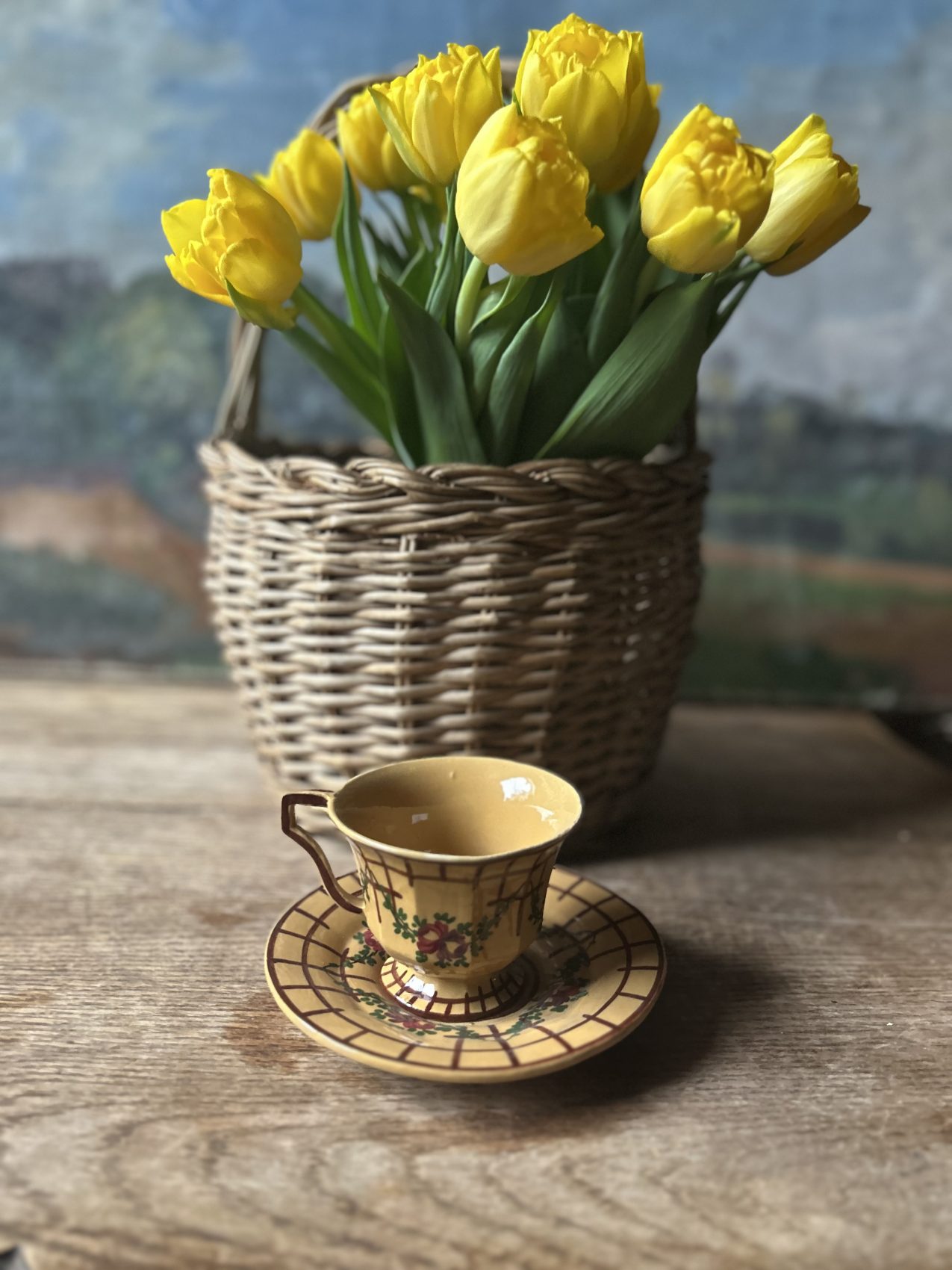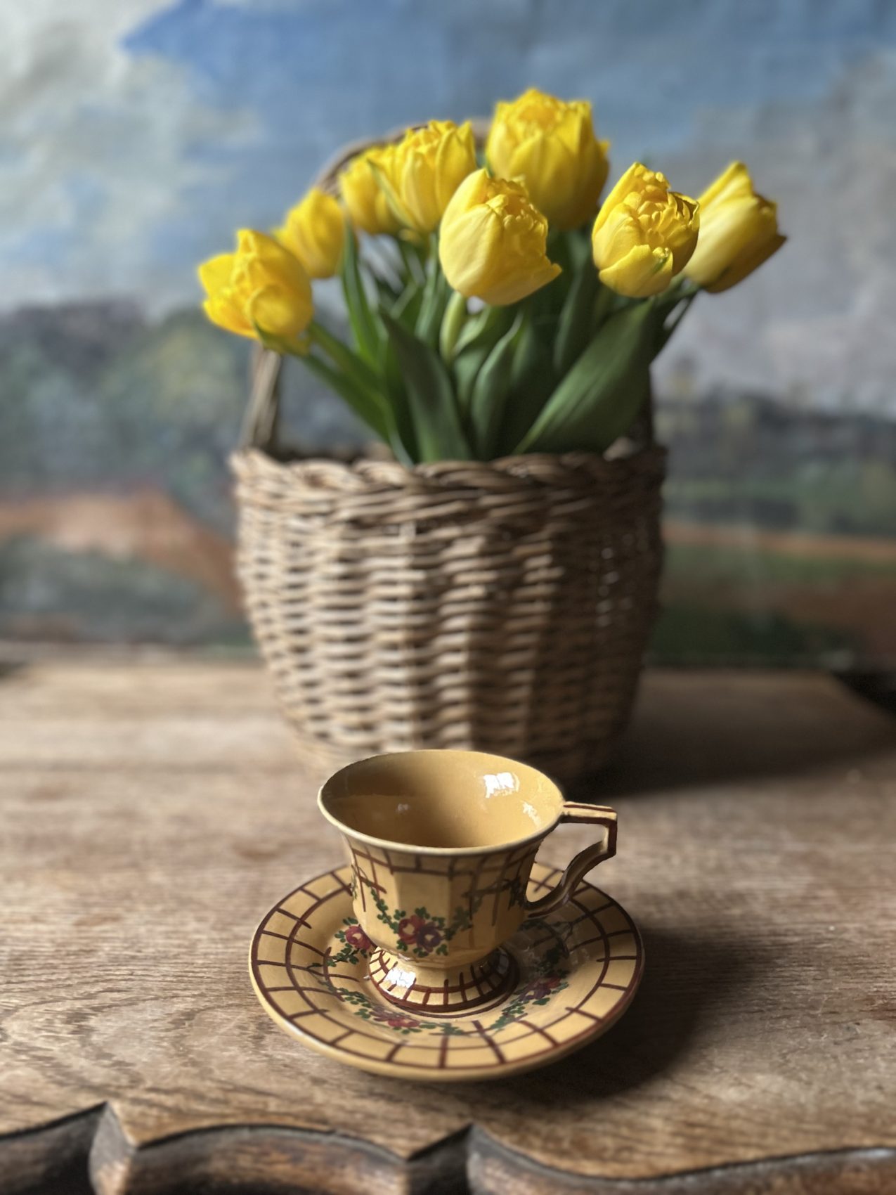 Une tasse de 1900 avec des roses délicates ,le charme discret d’un autre siècle au creux des mains.