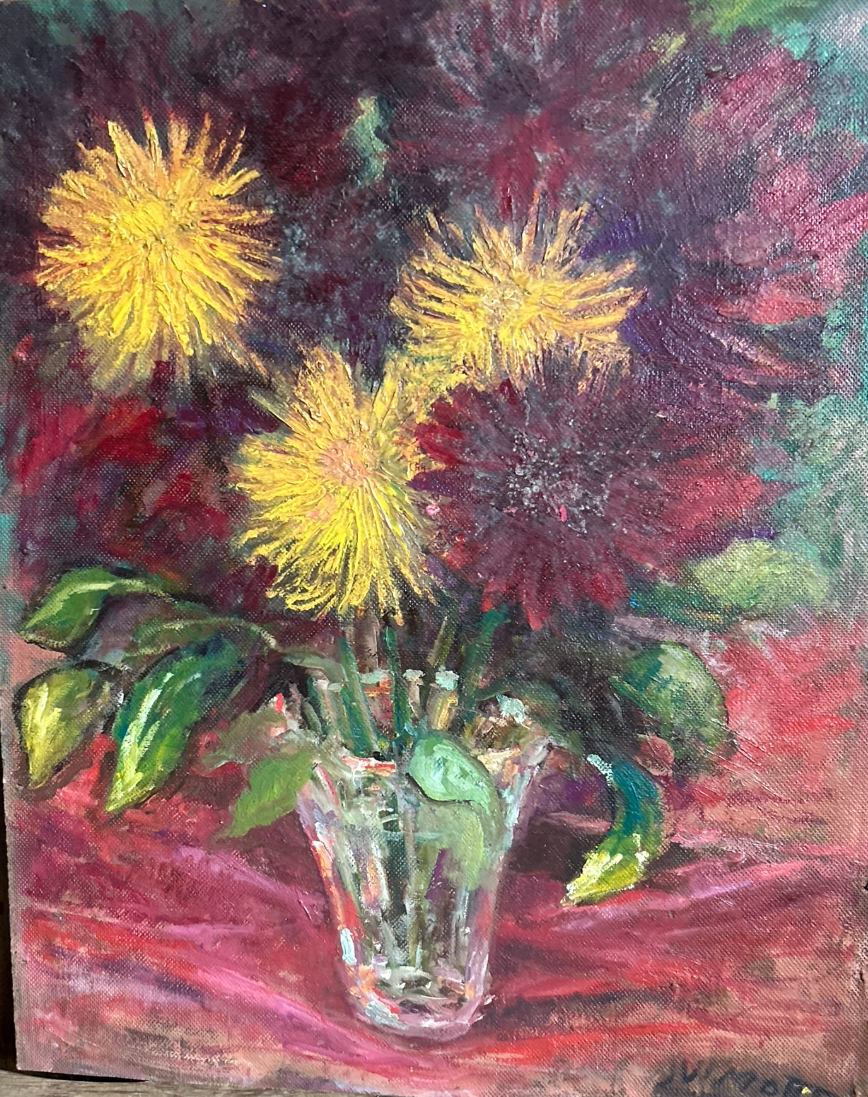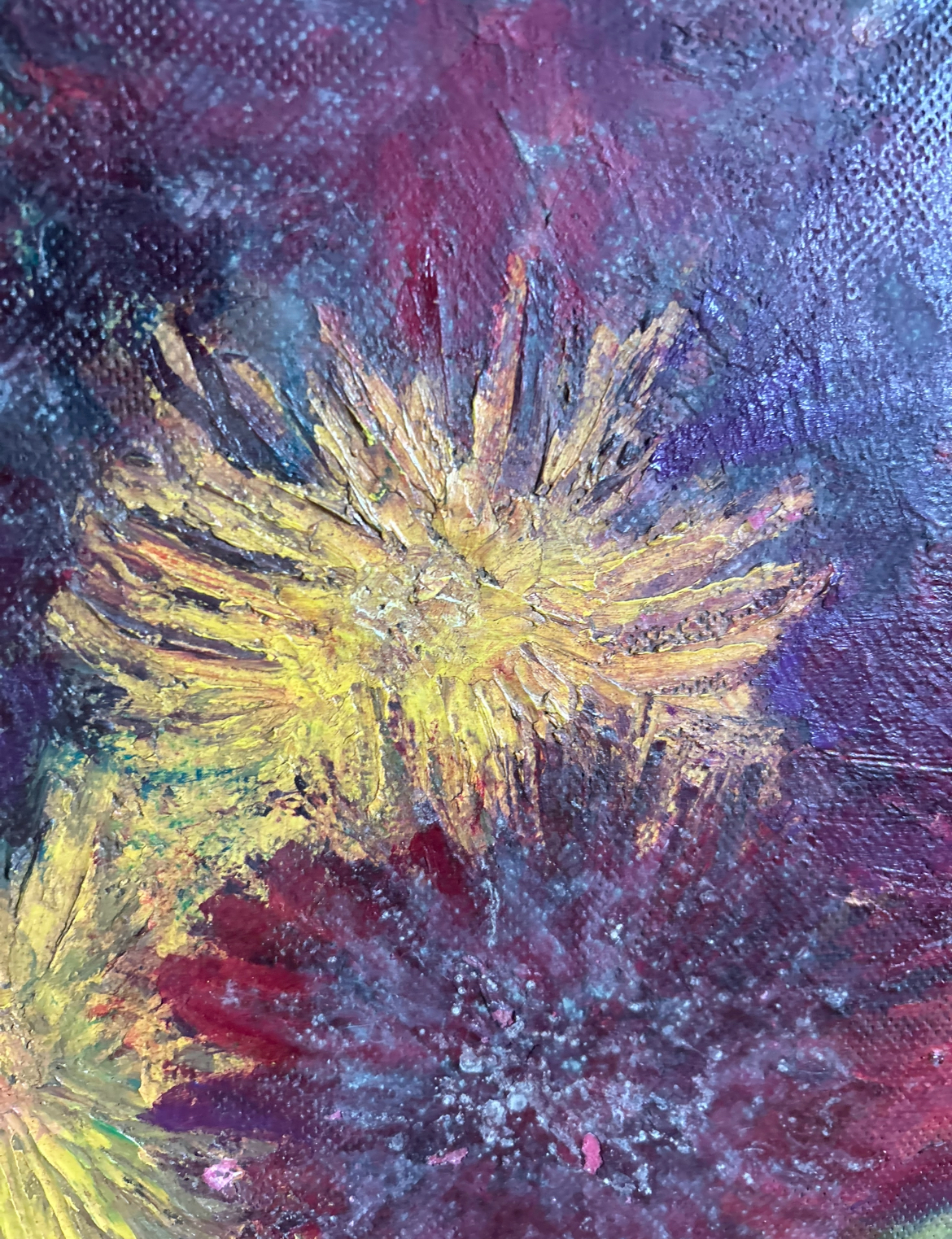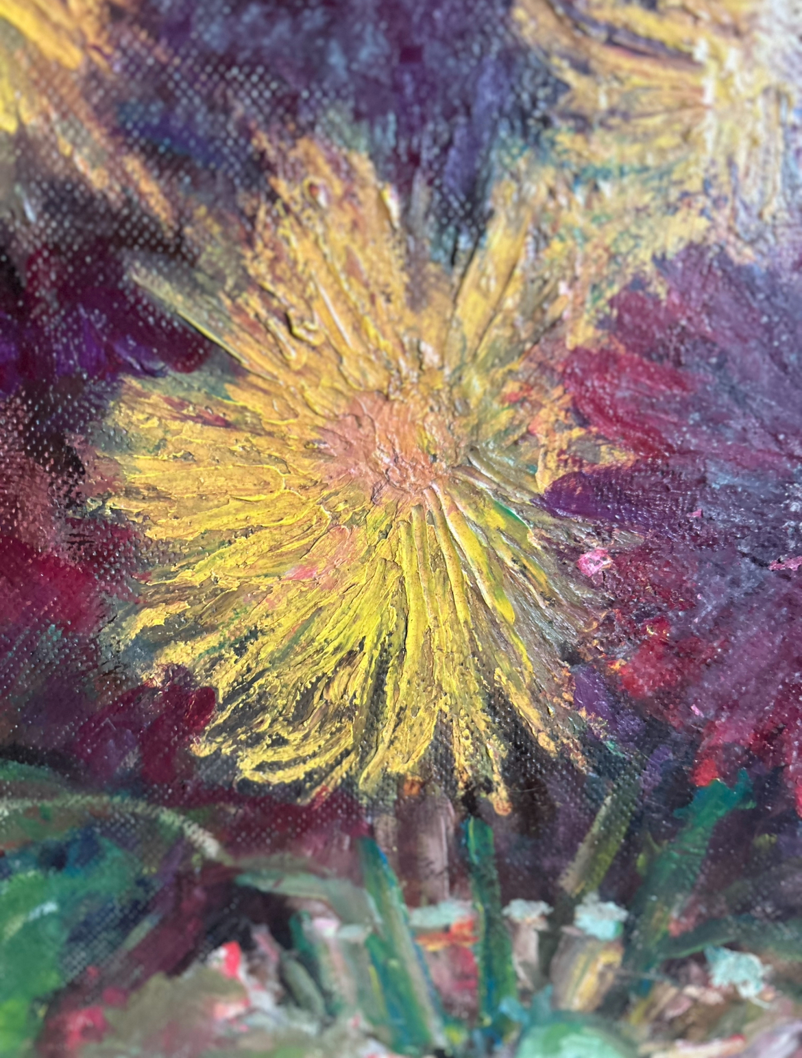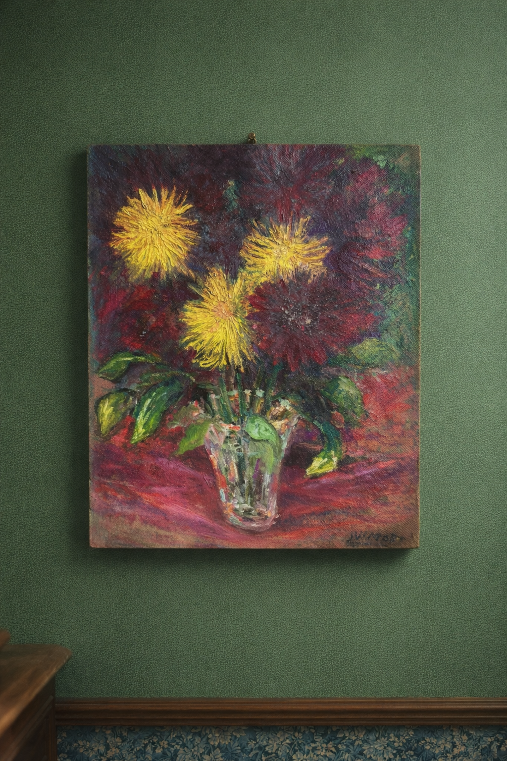 Tableau ancien années 50 – huile sur panneau bois – bouquet de chrysanthèmes 60 X45