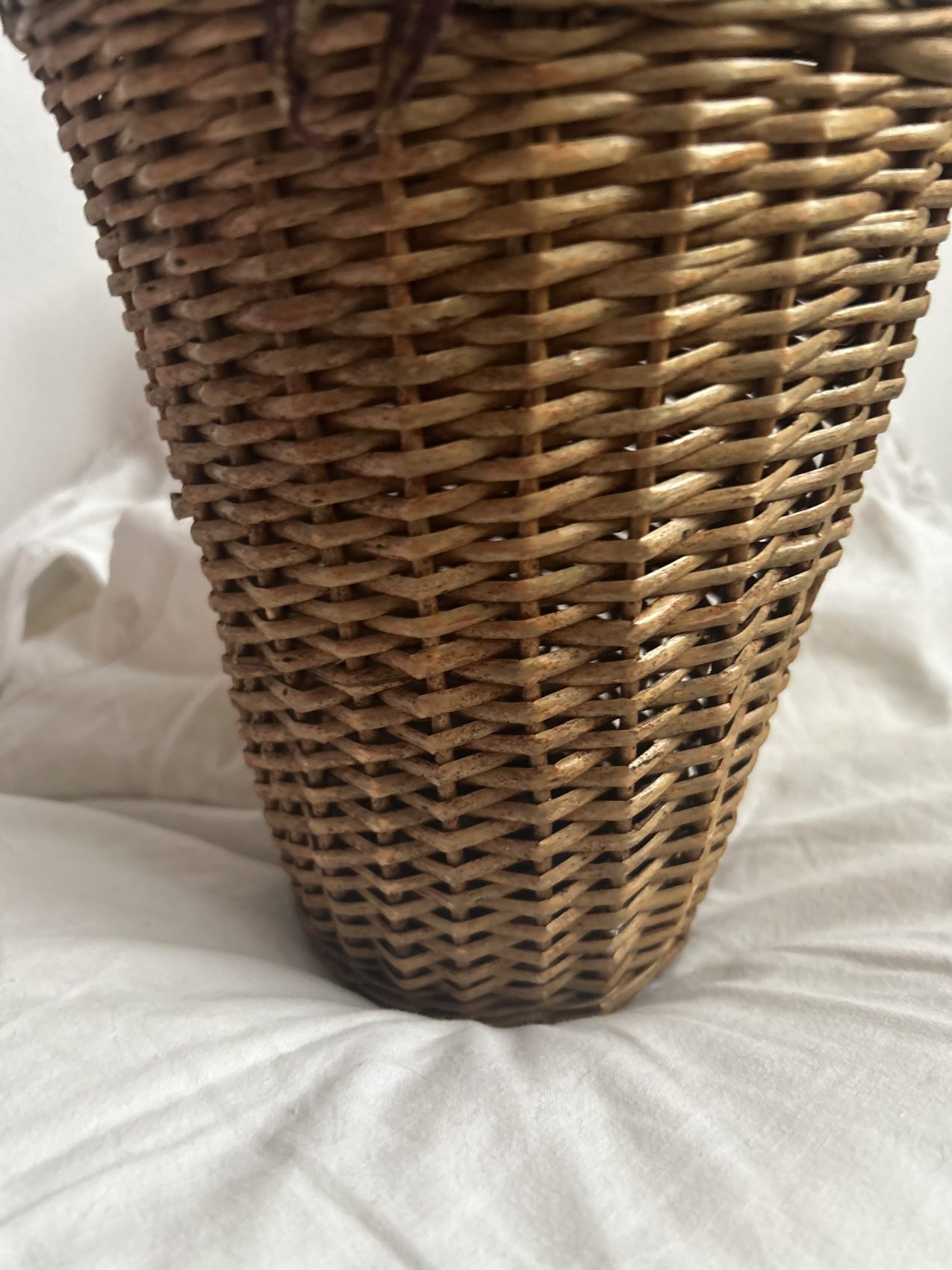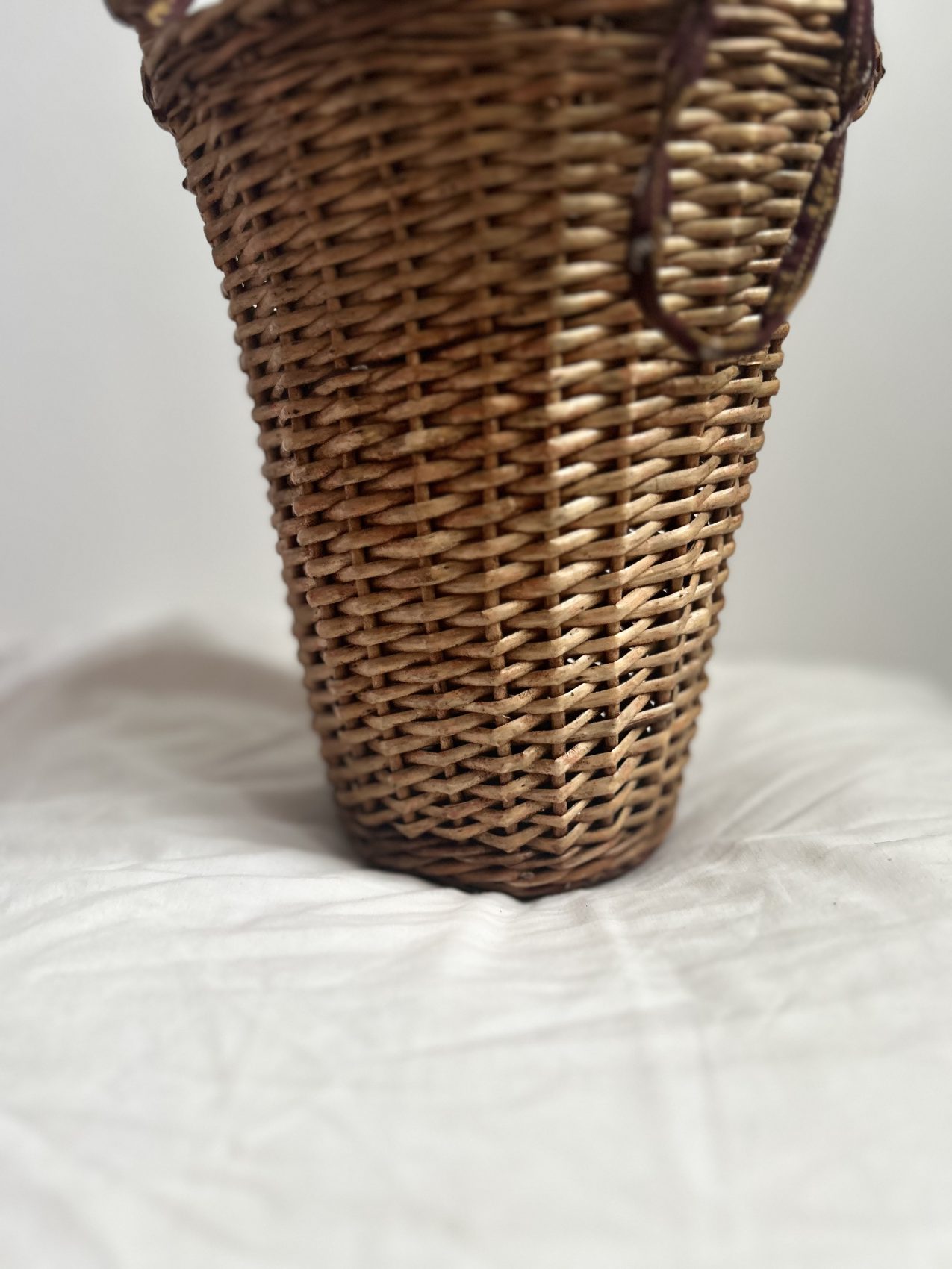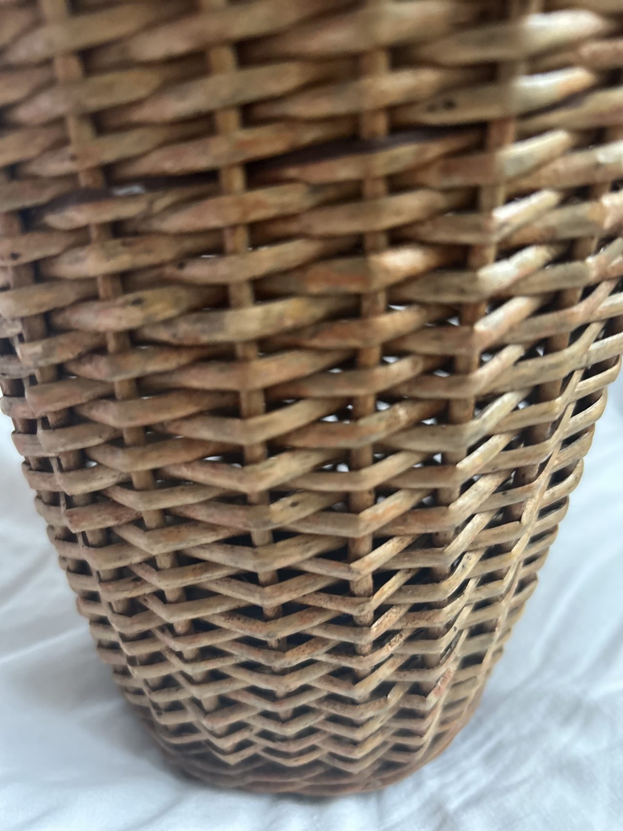 Ce panier en osier, de forme tonneau, est un adorable travail artisanal des années 60.