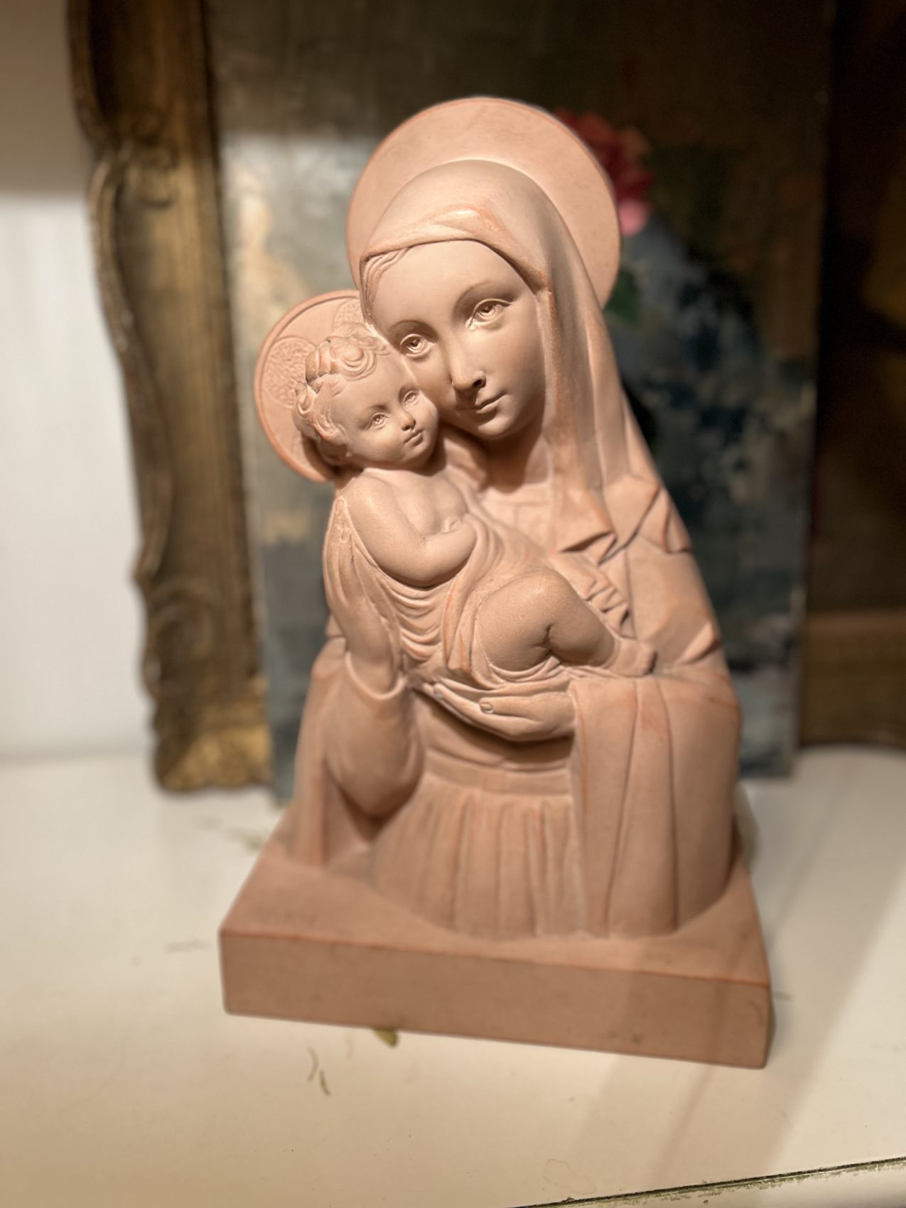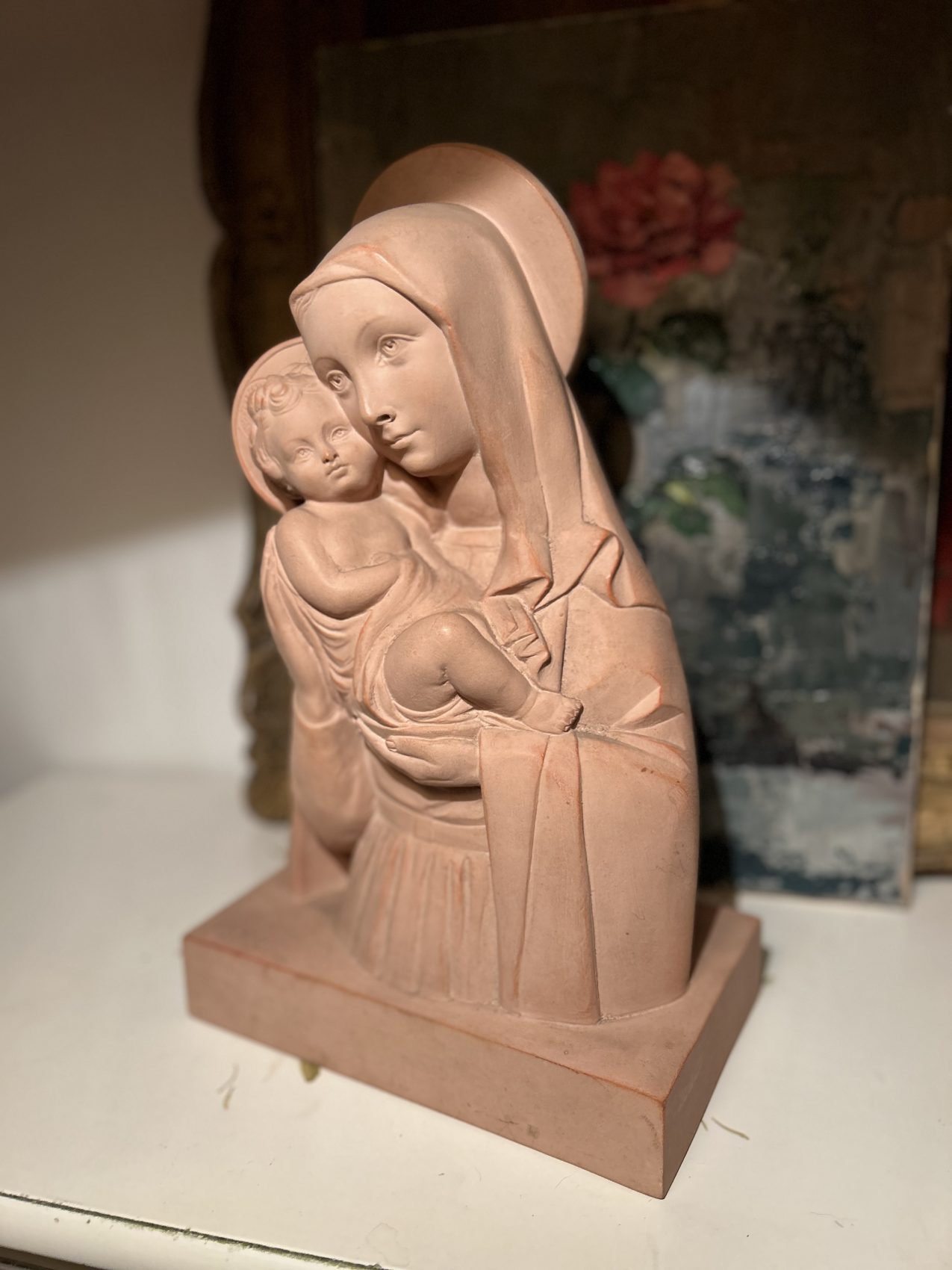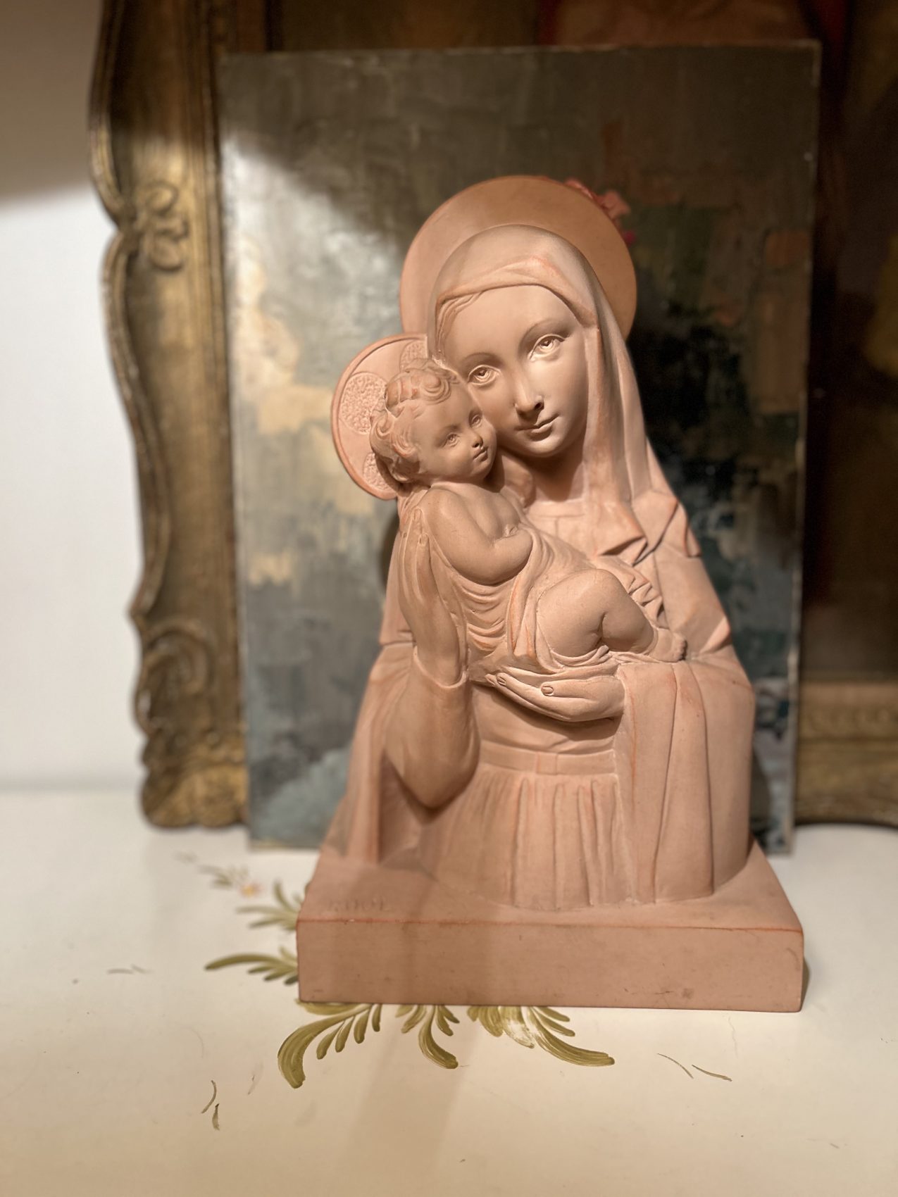 Sculpture en terre cuite « Vierge à l’enfant » signée Rhul