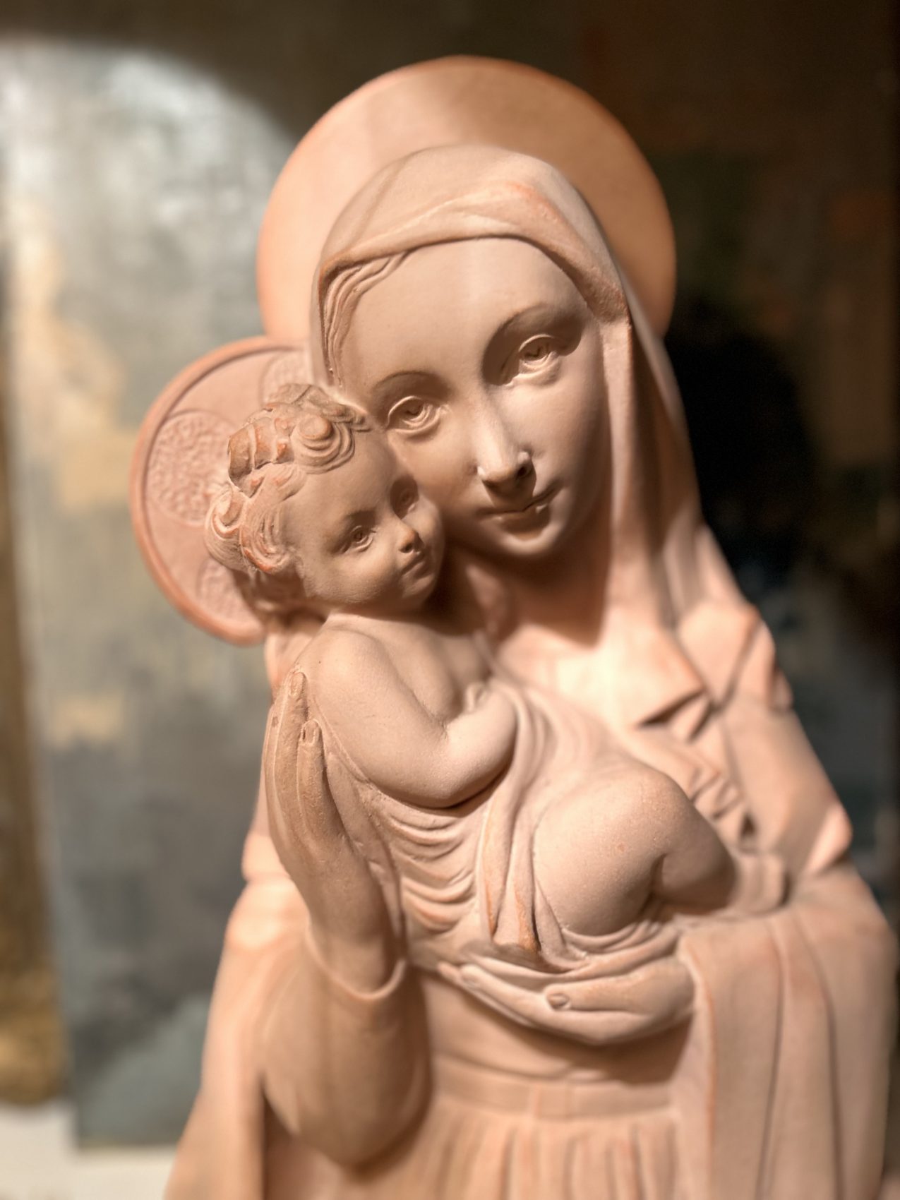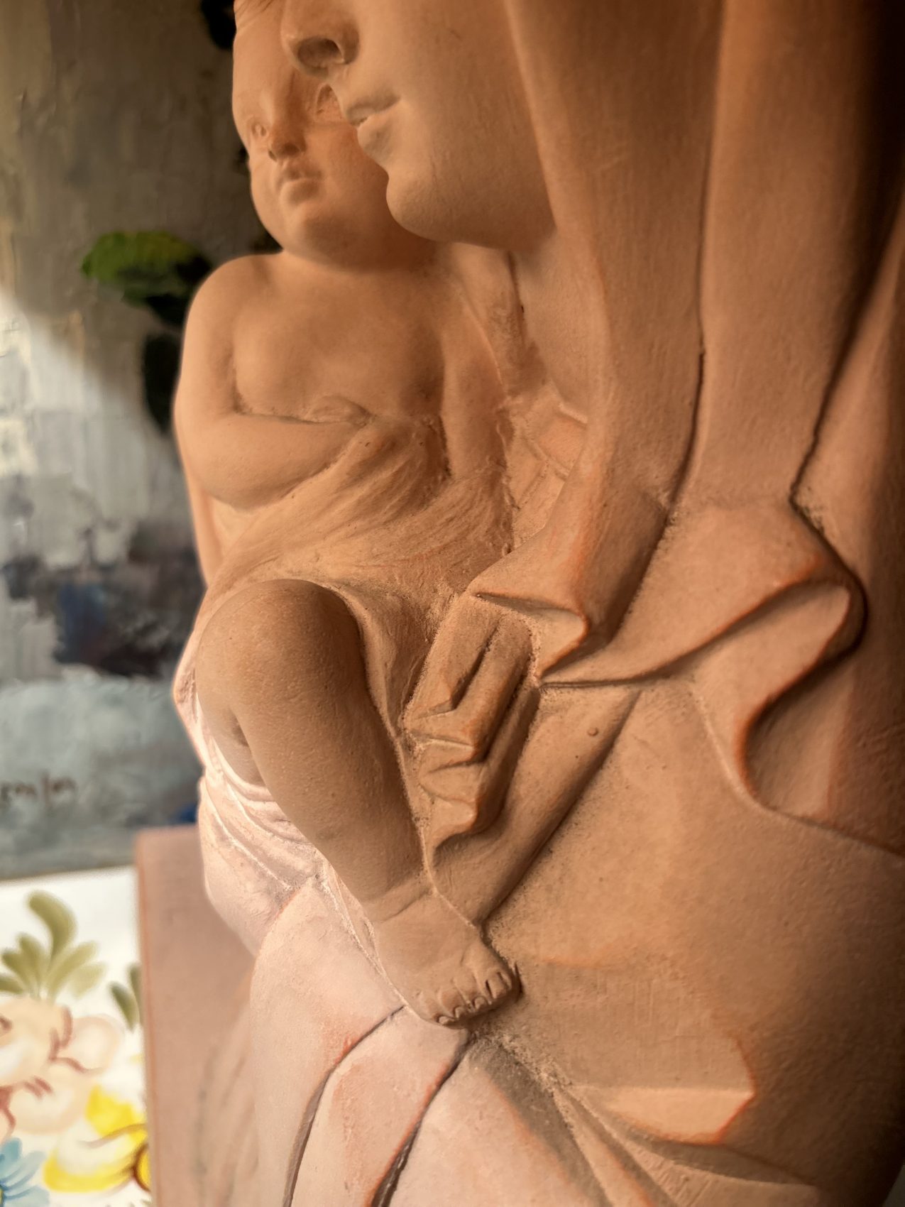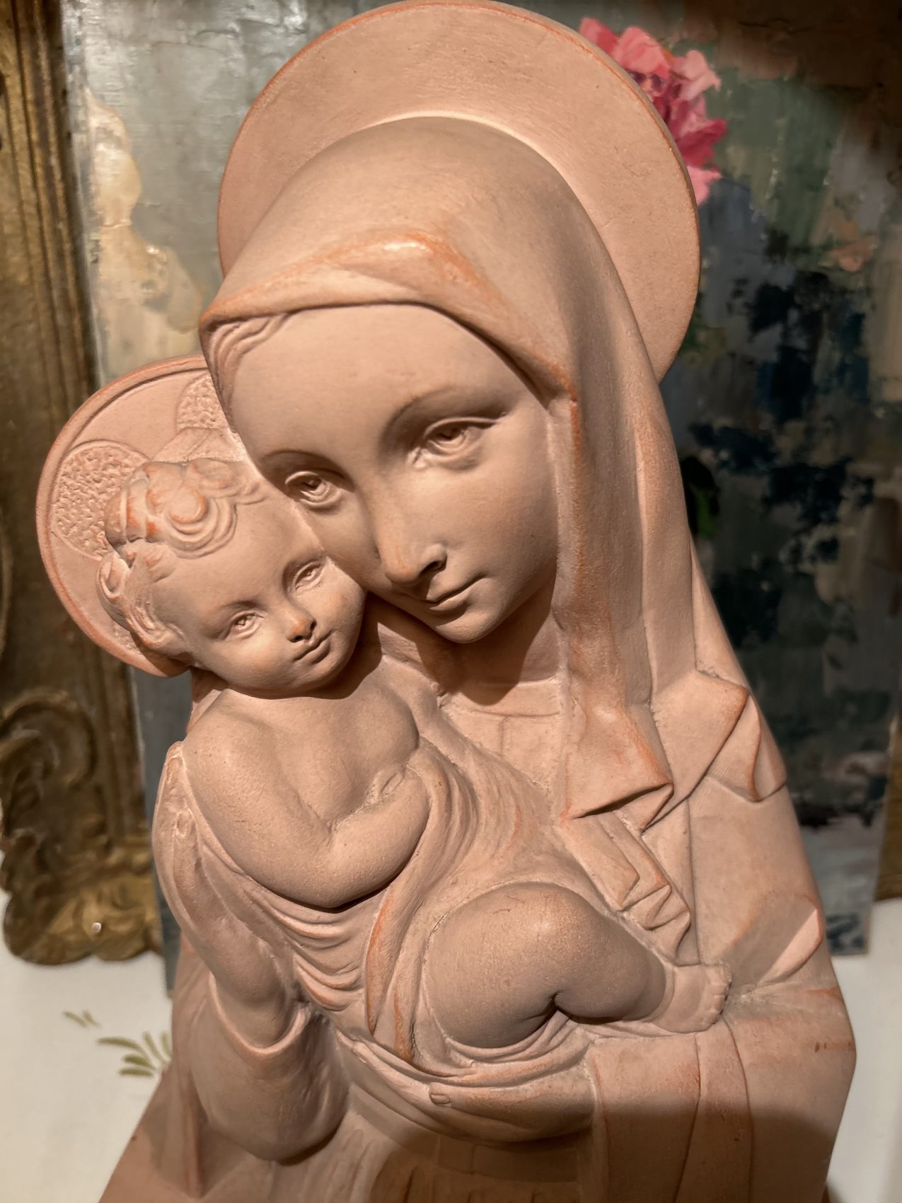 Sculpture en terre cuite « Vierge à l’enfant » signée Rhul