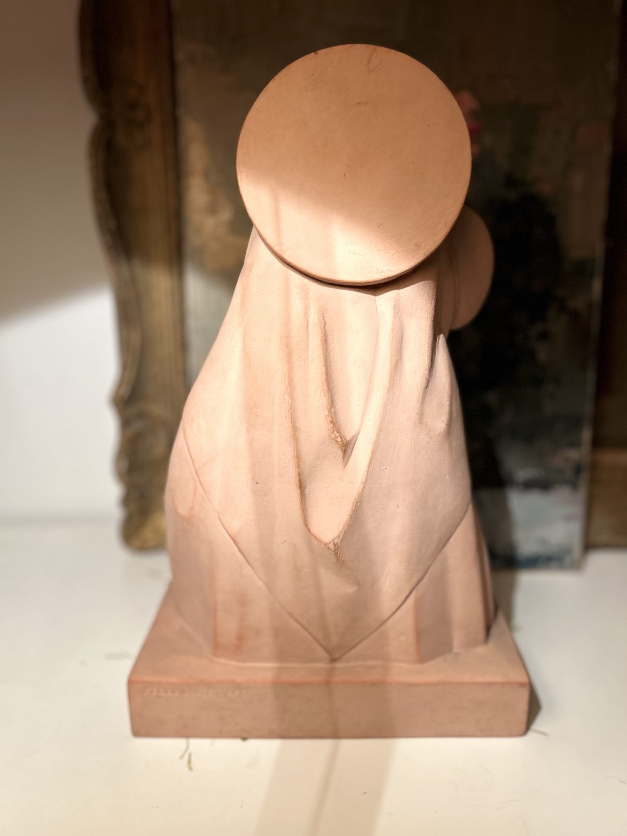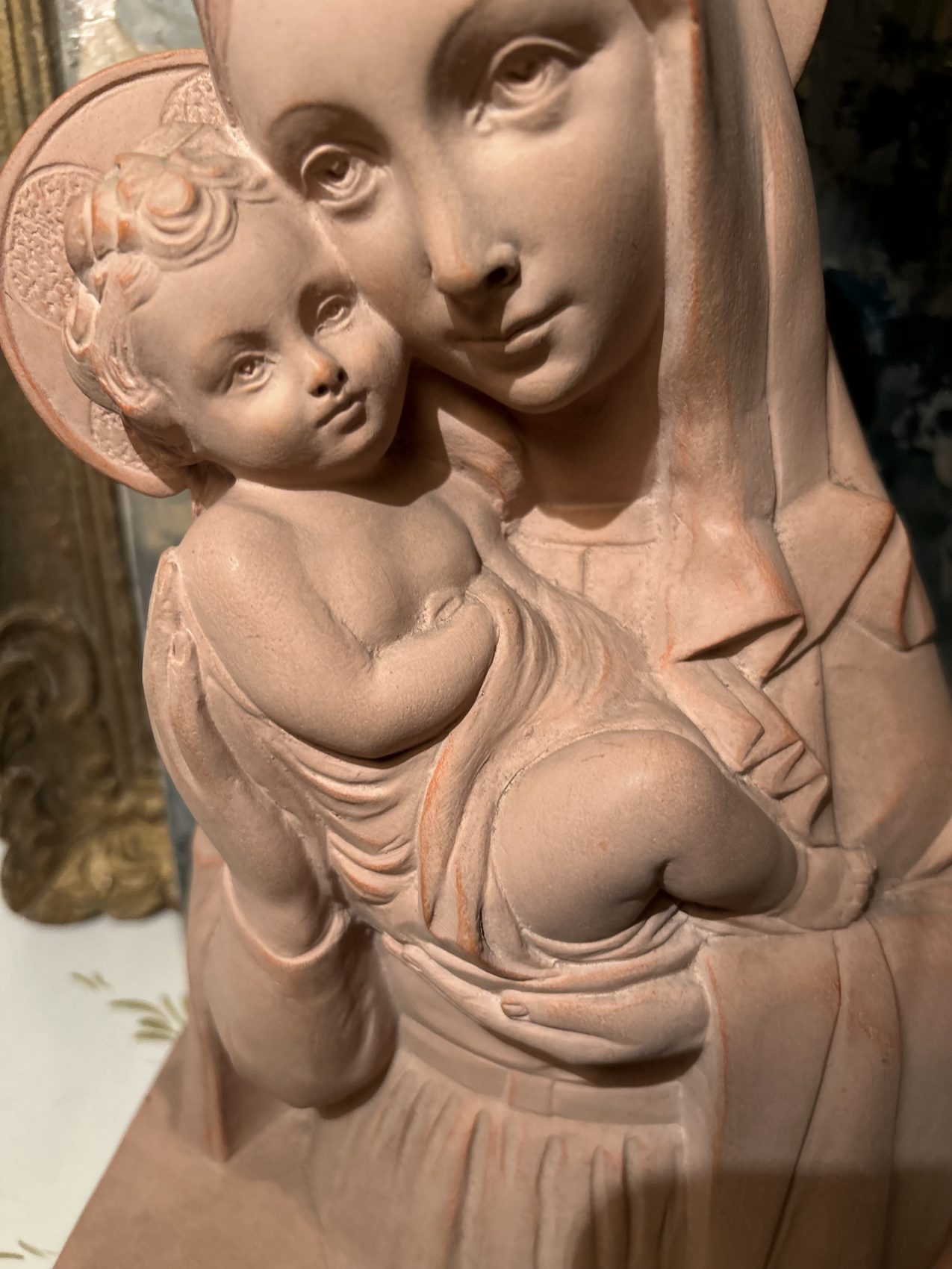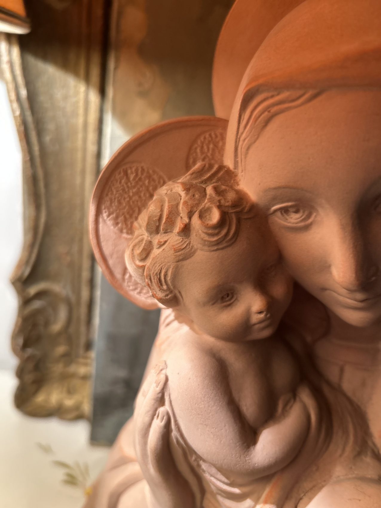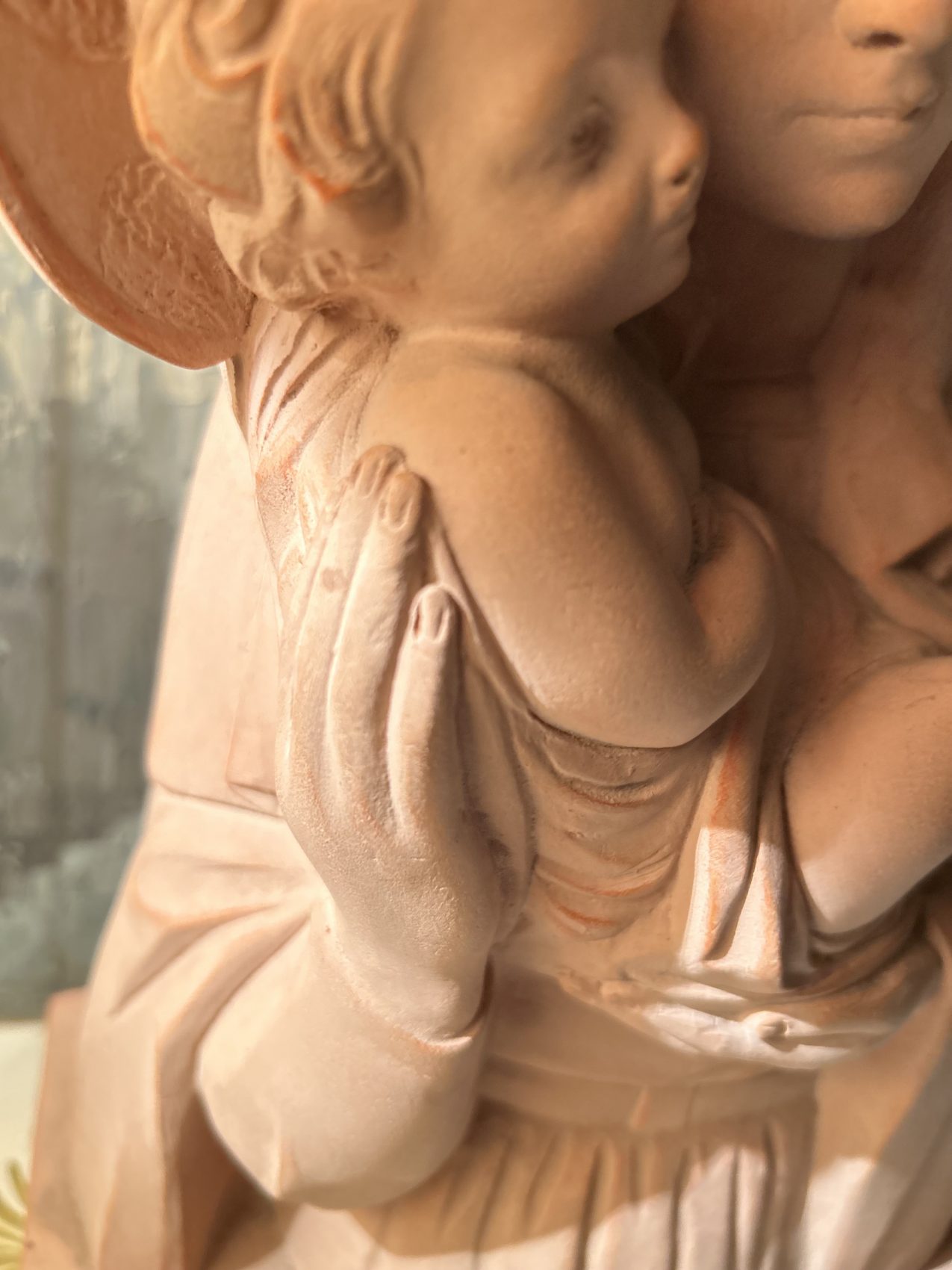 Grande Sculpture en terre cuite « Vierge à l’enfant » signée Rhul – Époque 1900 – L’éloge de la douceur