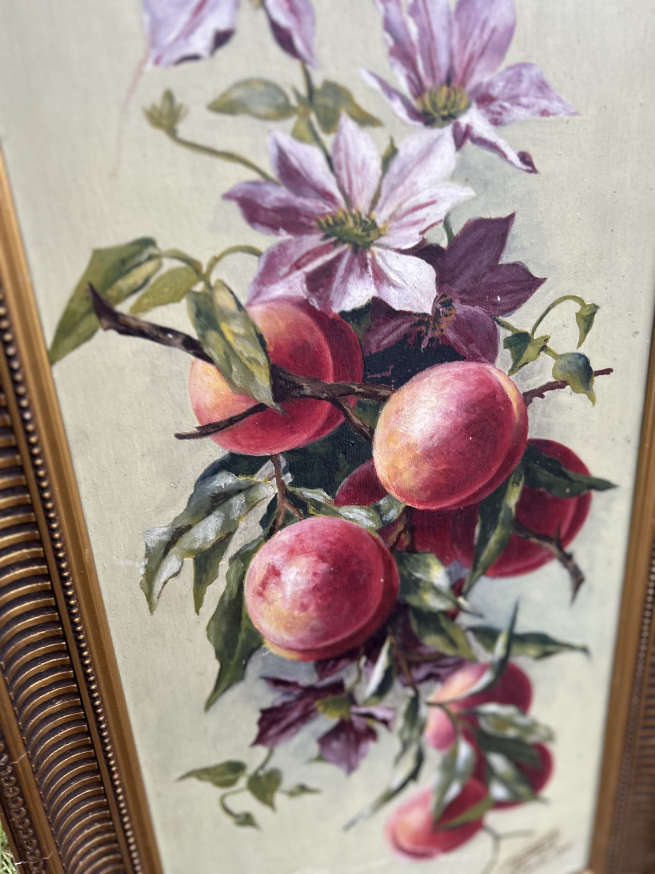 Tableau ancien nature morte aux fruits de l’été – Peinture à l’huile sur bois vers 1900
