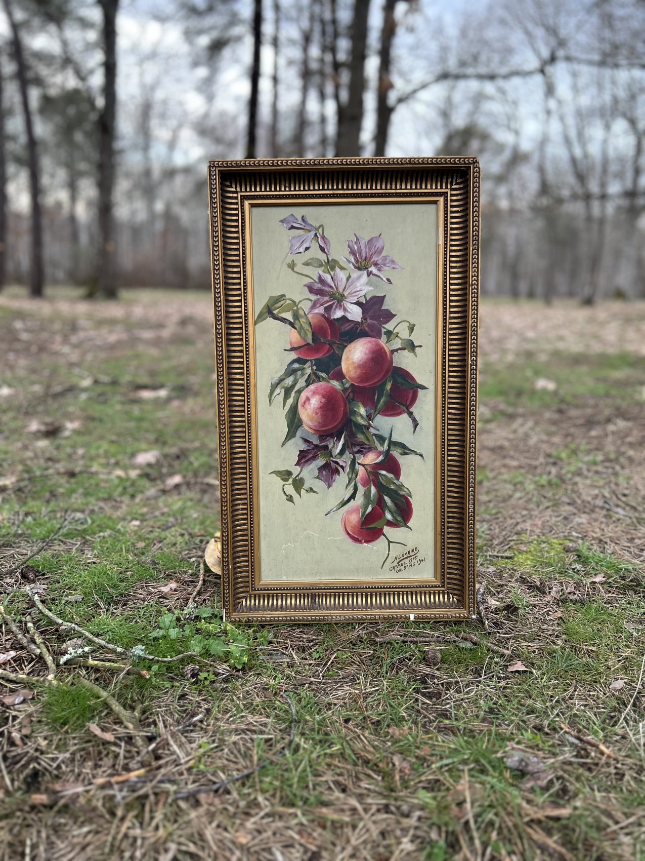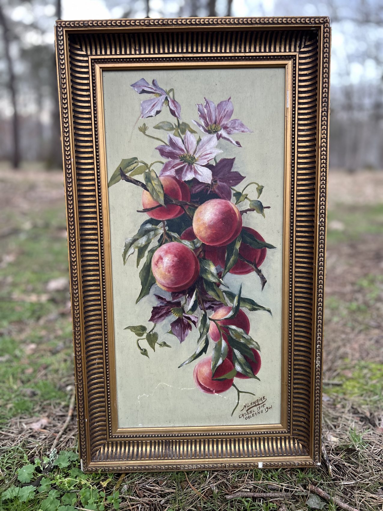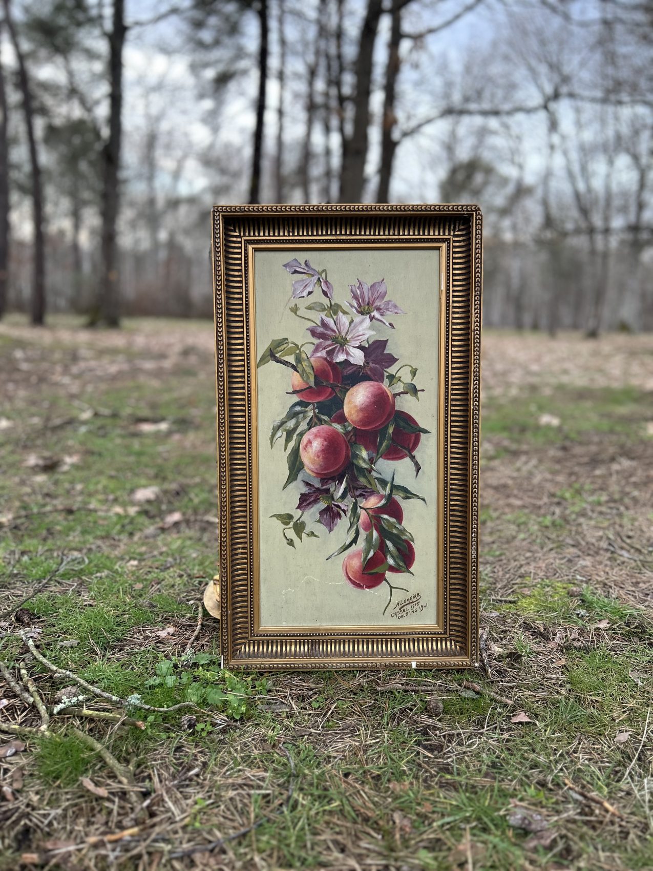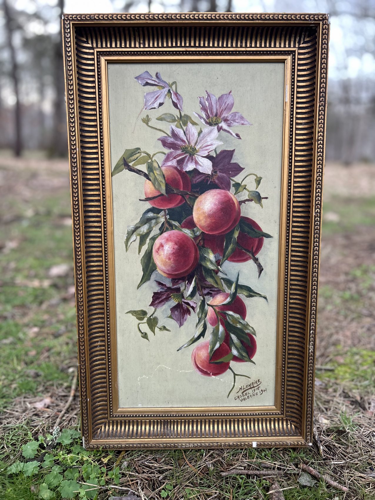 Ce tableau, peint à l’huile sur bois vers 1900, représente une allégorie de l’été, à travers une composition équilibrée mêlant fruits gorgés de soleil et fleurs délicates. Il était courant à l’époque de les accrocher dans une salle à manger ou une cuisine, lieux de vie par excellence, où la peinture dialoguait avec le quotidien.