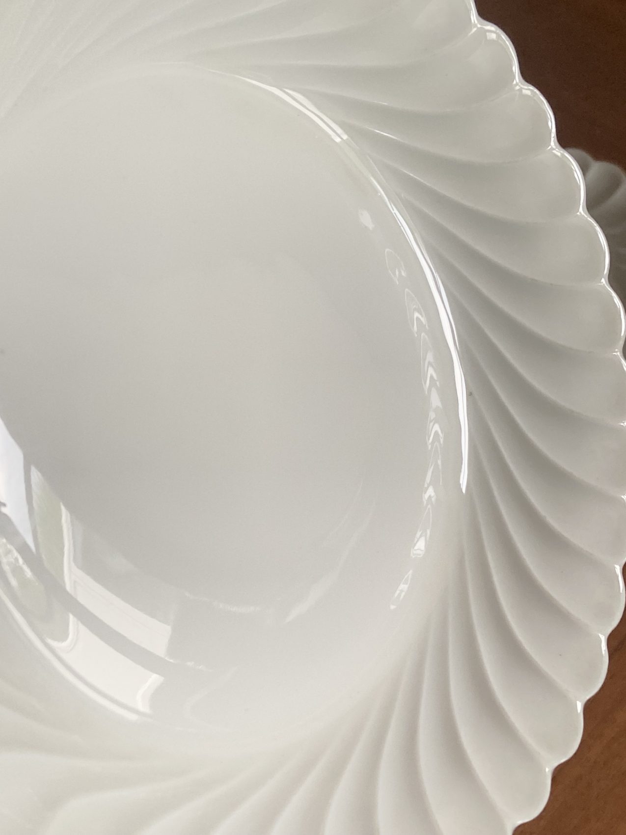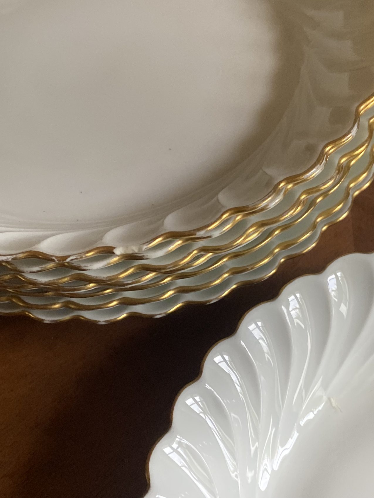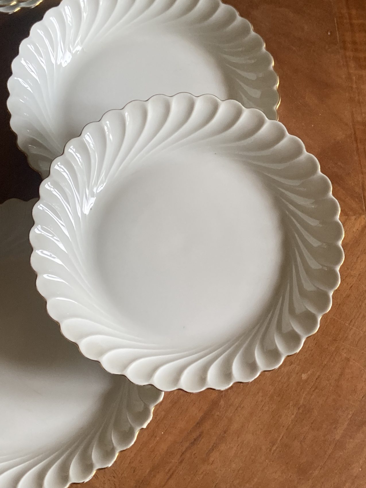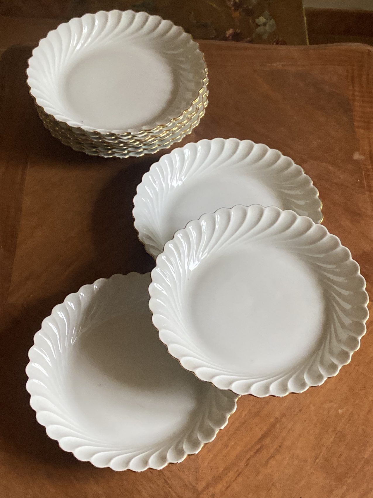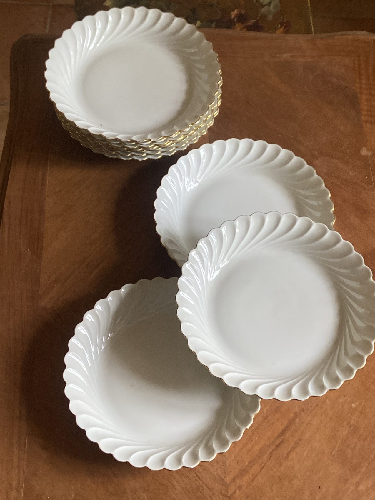 Datant des années 80, elles offrent un décor sobre et raffiné : fond blanc éclatant, liseré or fin, et élégant relief à volutes.