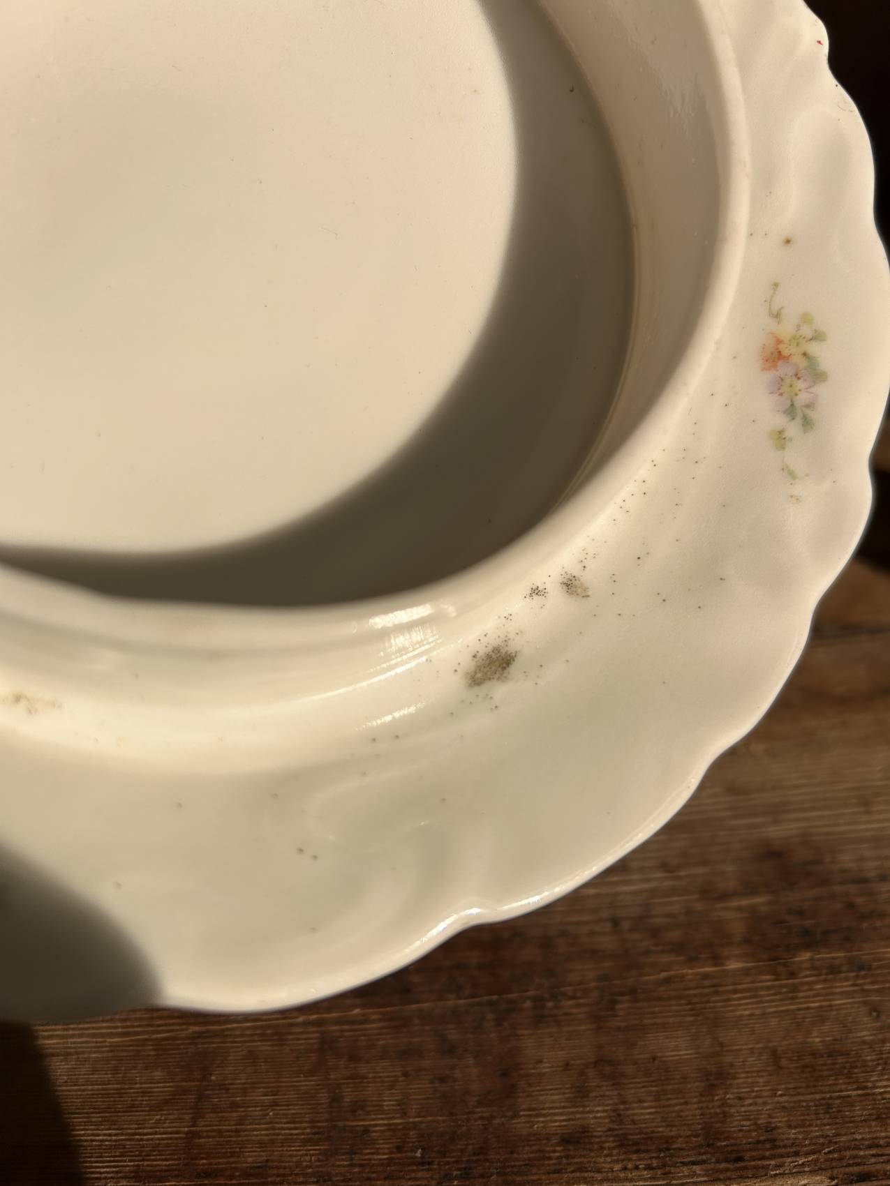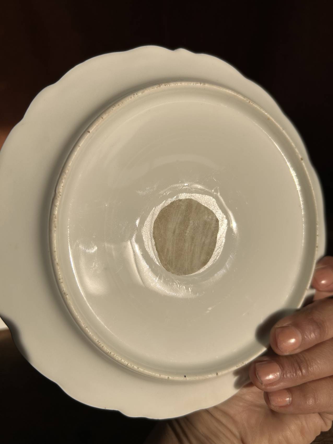 - Particularités : traces de fabrication (défauts d’émaillage en pourtour), absence probable d’anciennes dorures