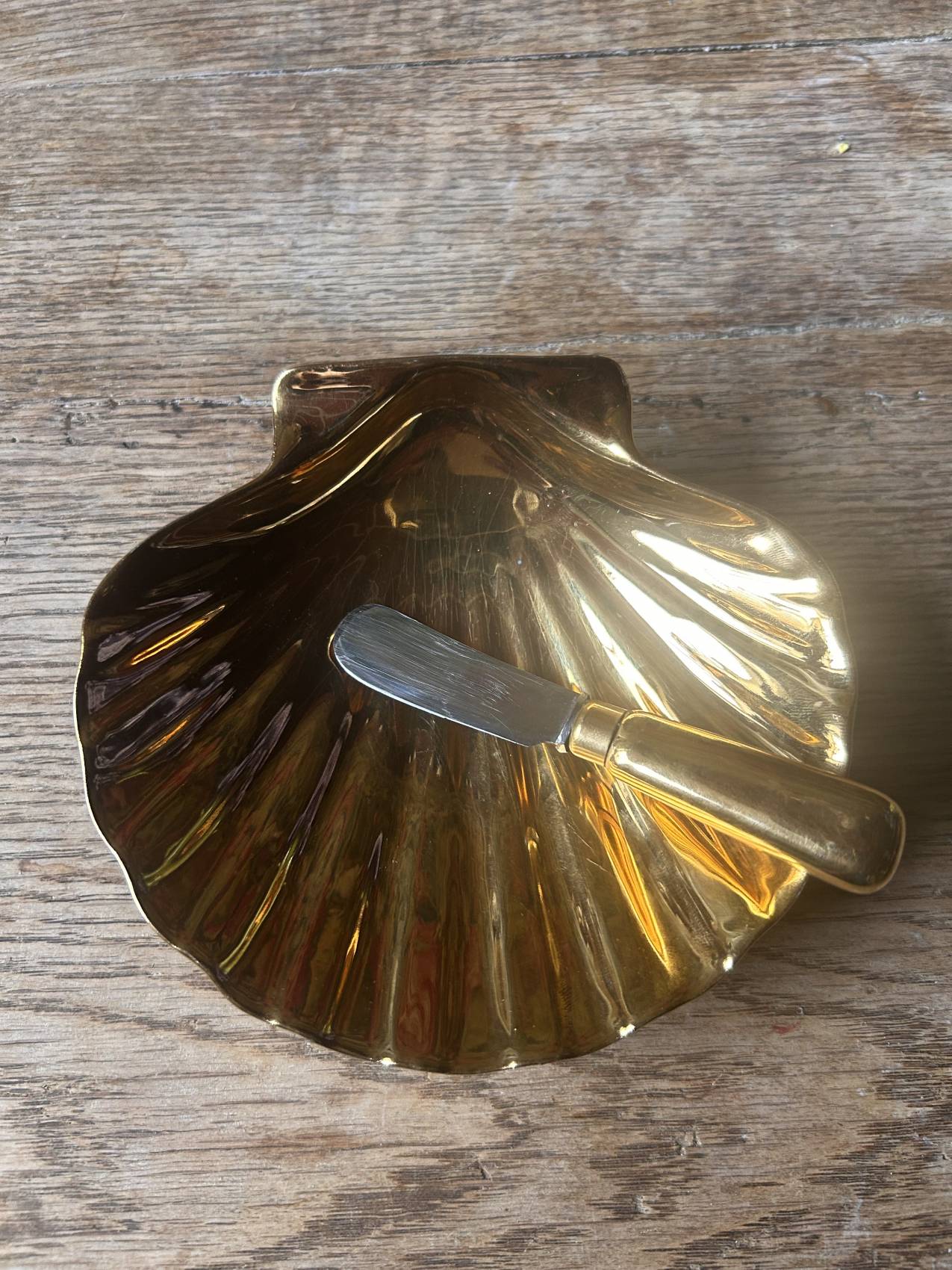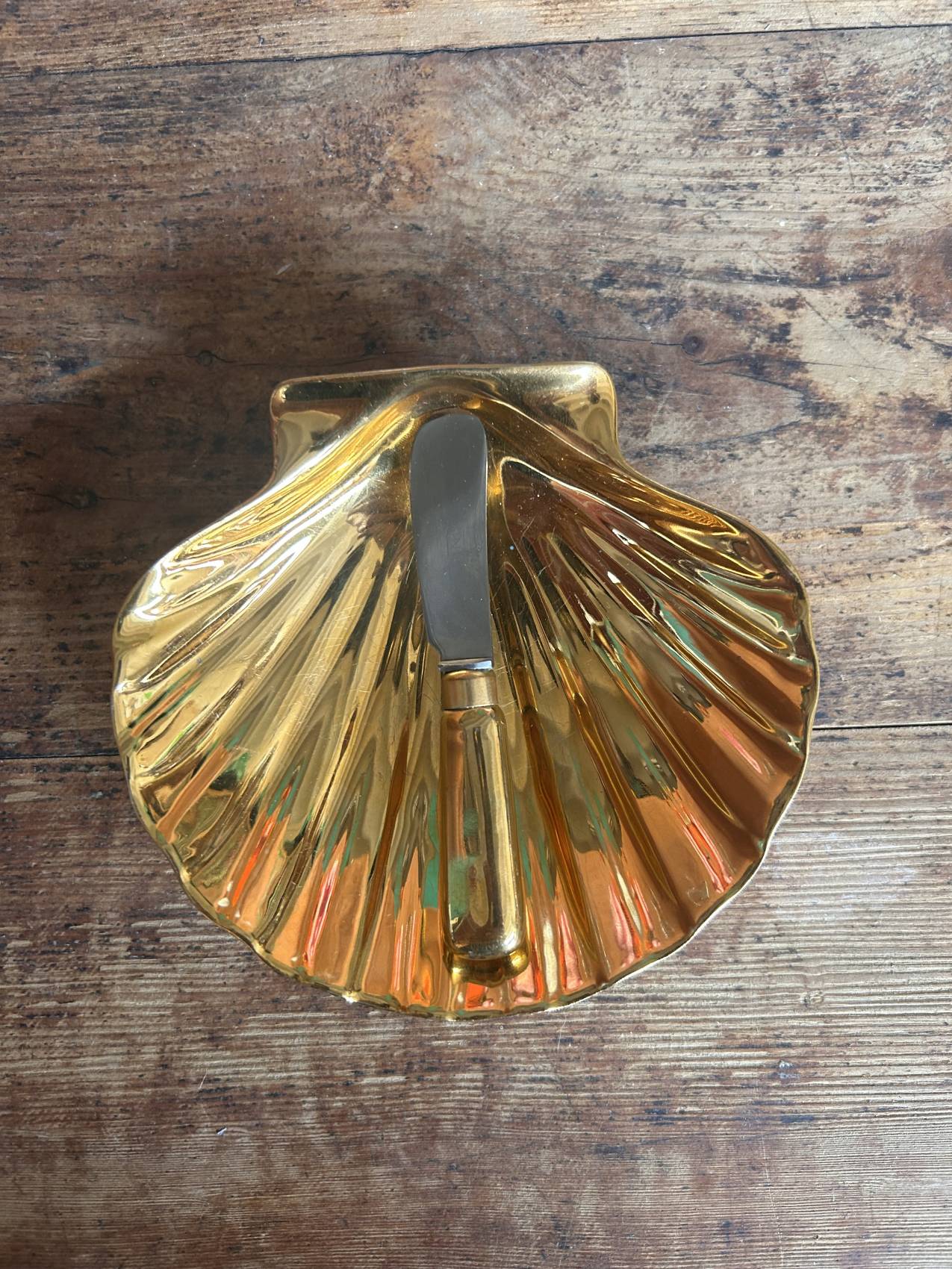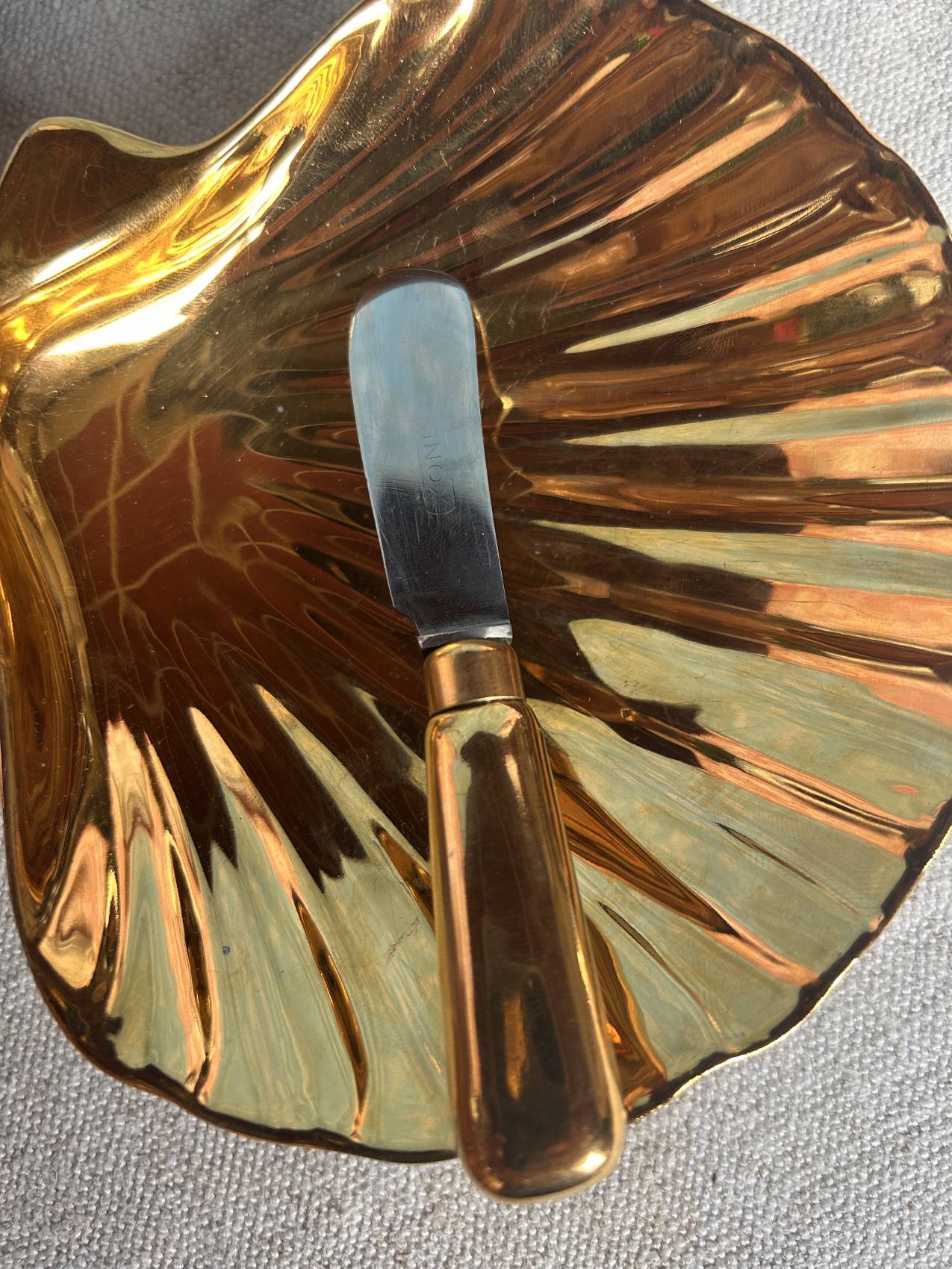 La forme est délicieuse : une coquille Saint-Jacques stylisée, avec un intérieur doré lumineux qui capte la lumière et donne tout de suite un côté très raffiné à la table.