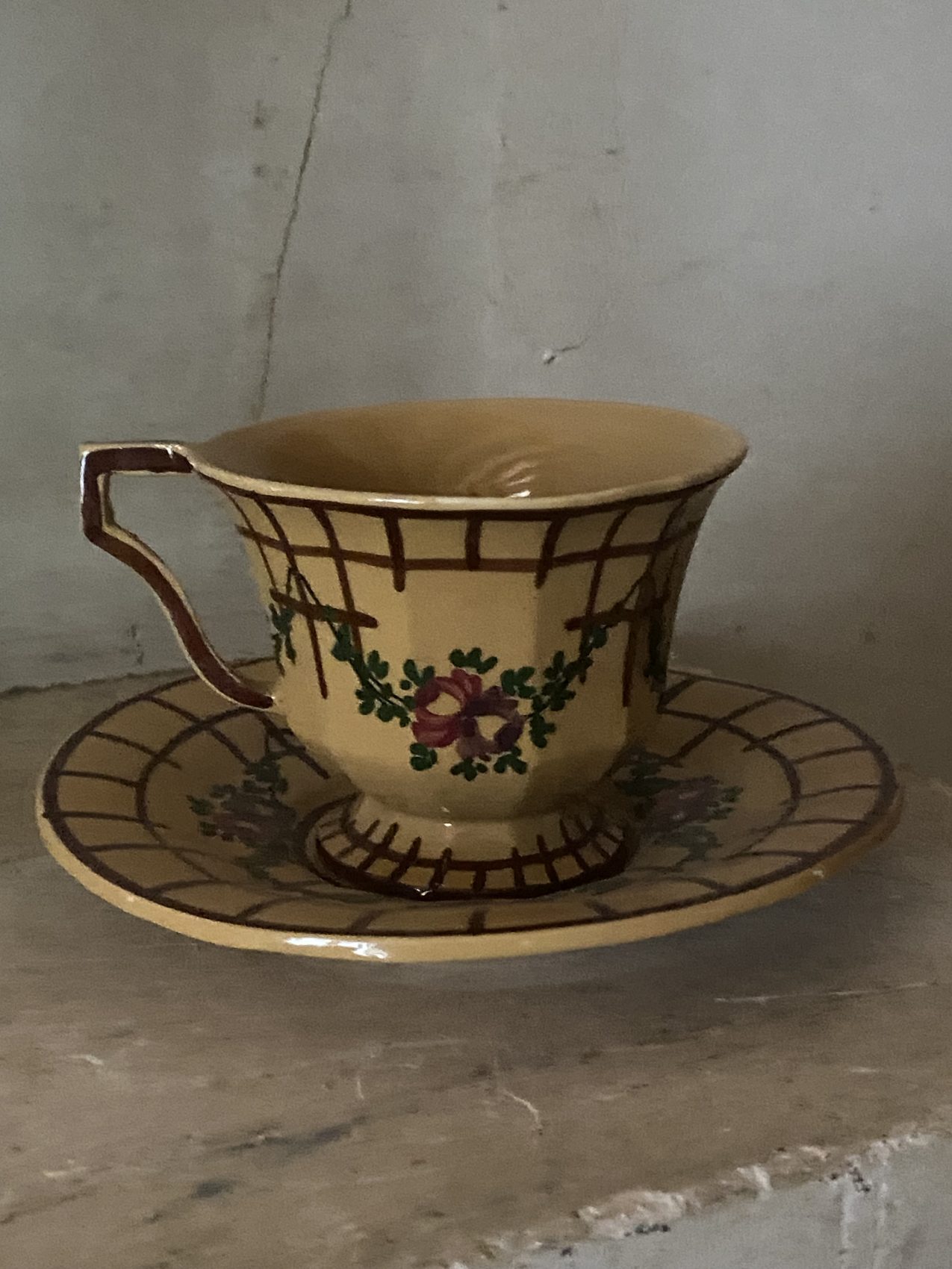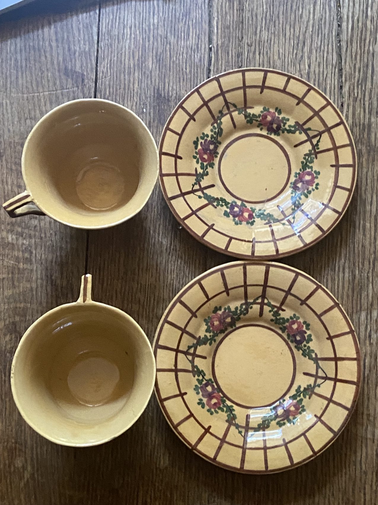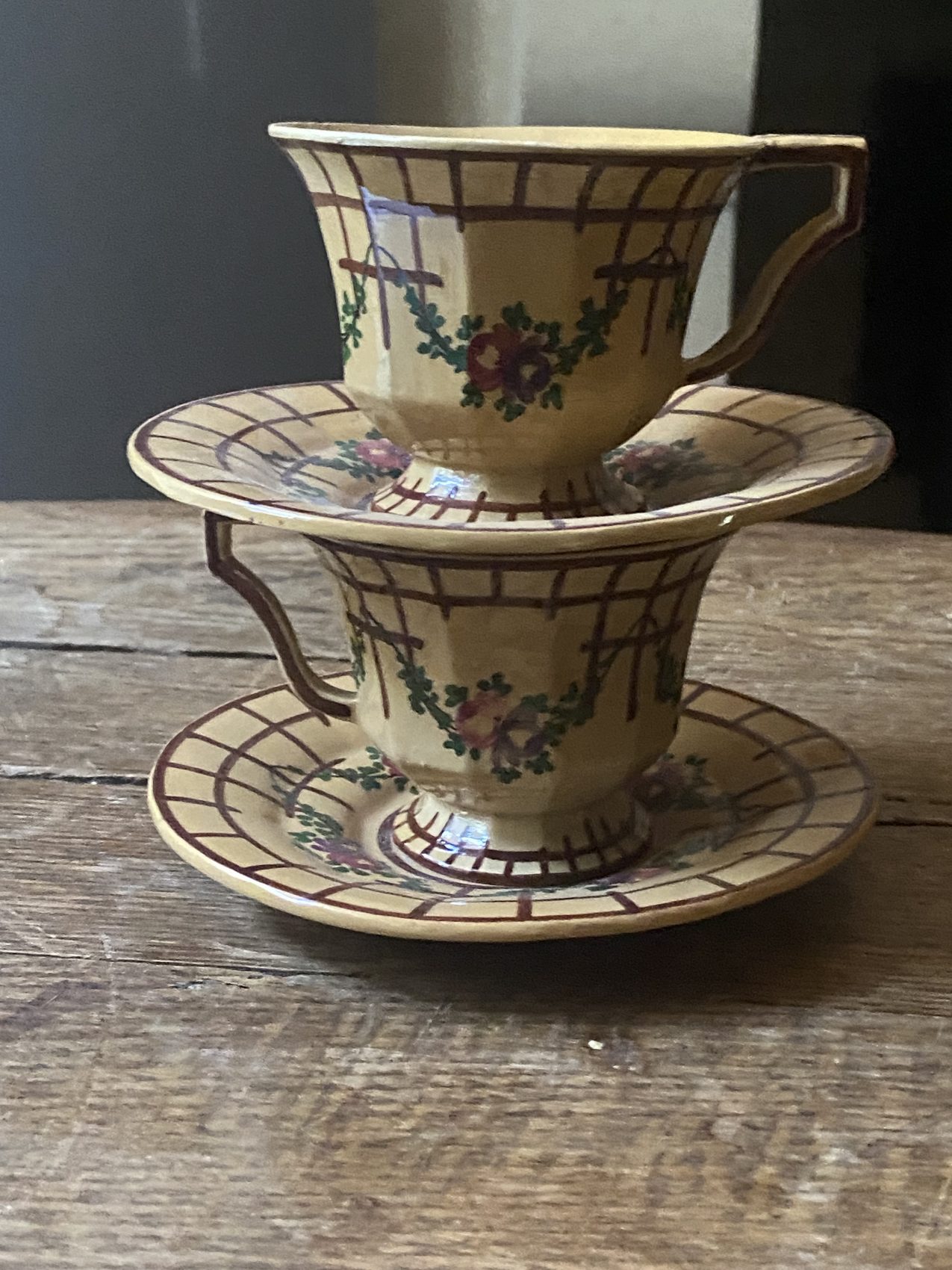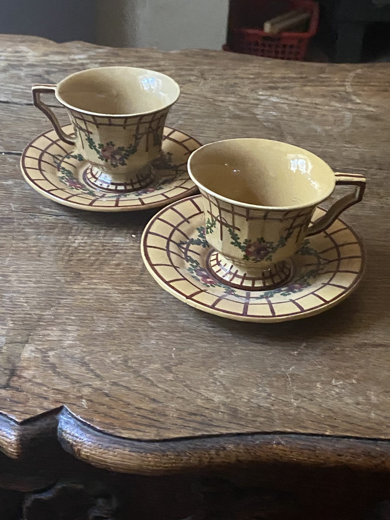 Duo de tasses anciennes en faïence de Malicorne – Époque Art Déco – Motif de roses