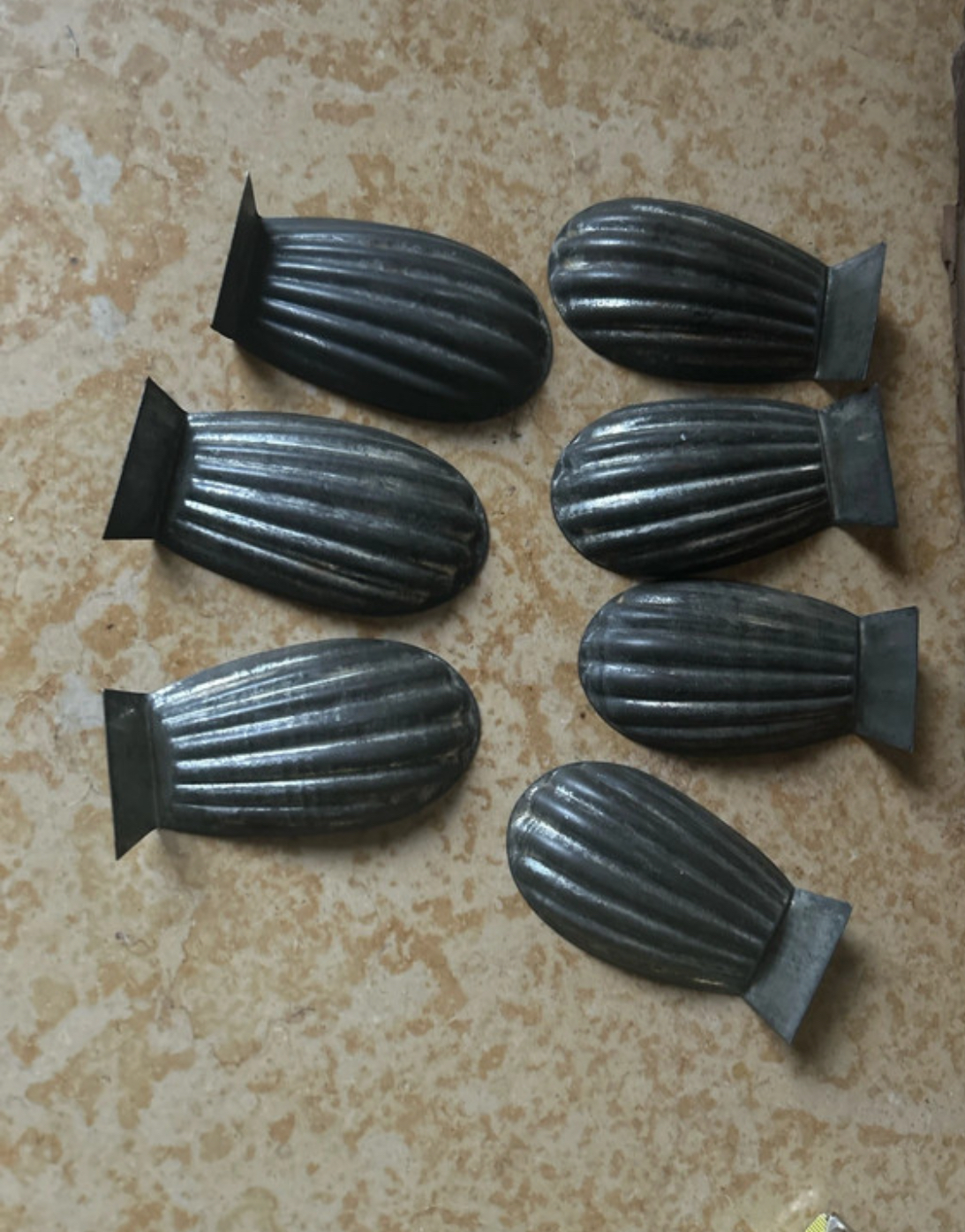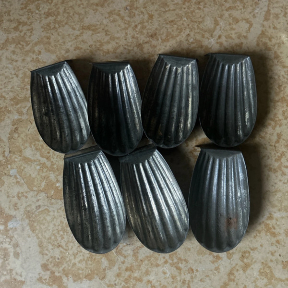 Lot de 7 moules à madeleines anciens en fer blanc, dimensions approximatives de chaque moule : 10 cm de longueur sur environ 5 cm de largeur, époque estimée : fin XIXᵉ – première moitié du XXᵉ siècle, état ancien avec traces d’usage conformes à leur âge et à leur fonction d’origine.