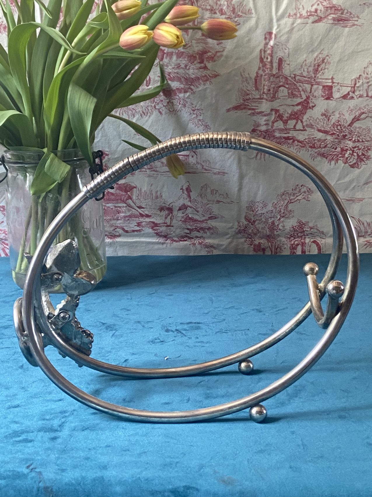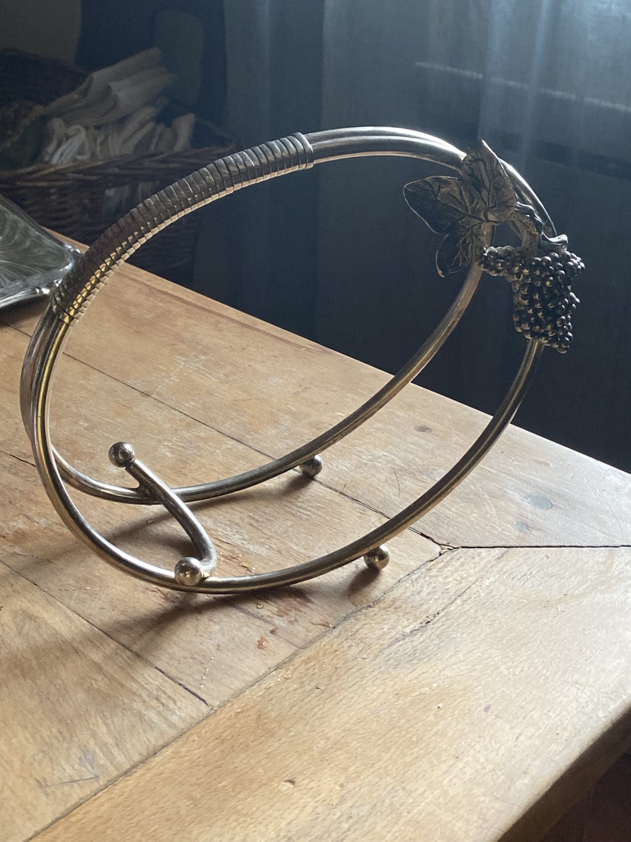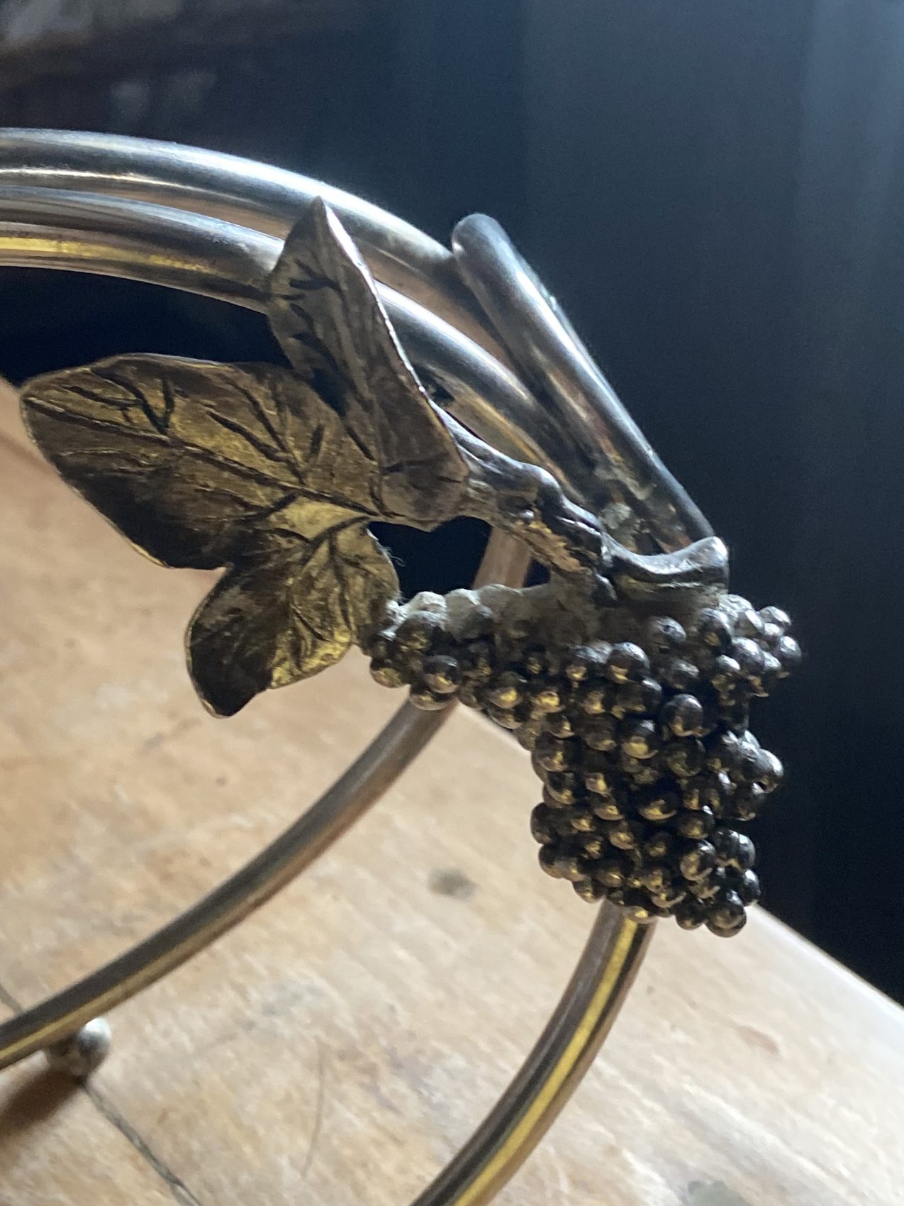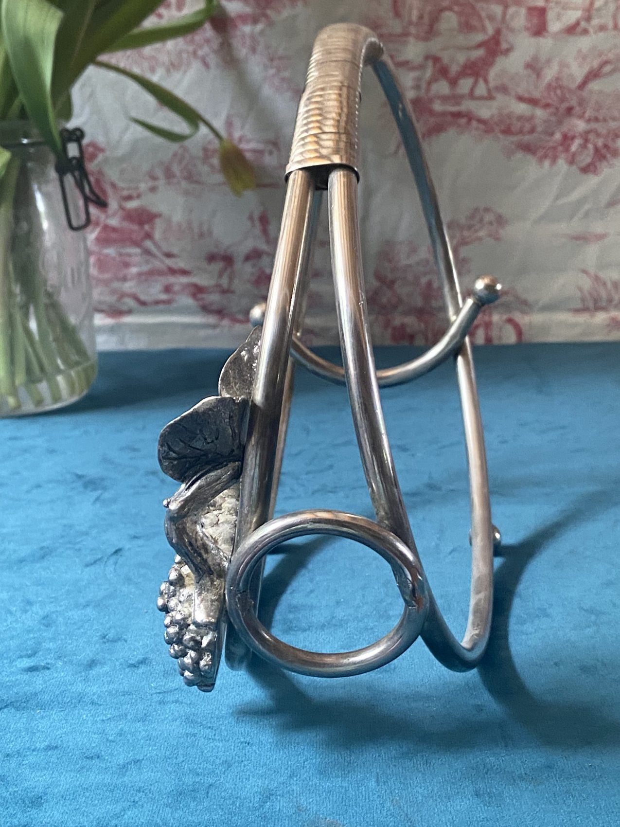Ce serviteur à vin en métal argenté, orné d’un délicat motif de grappe de raisin et de feuille de vigne, a cette allure tranquille des objets qui savent exactement ce qu’ils font là.