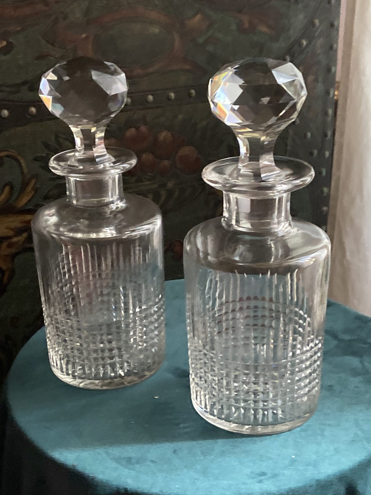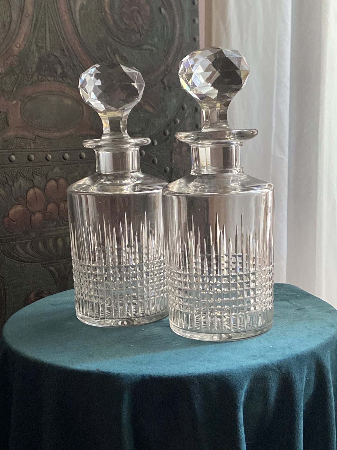 La Brocante Bucolique propose une superbe paire de flacons en cristal taillé signés Baccarat, modèle Nancy, encore au catalogue actuel de la célèbre cristallerie.