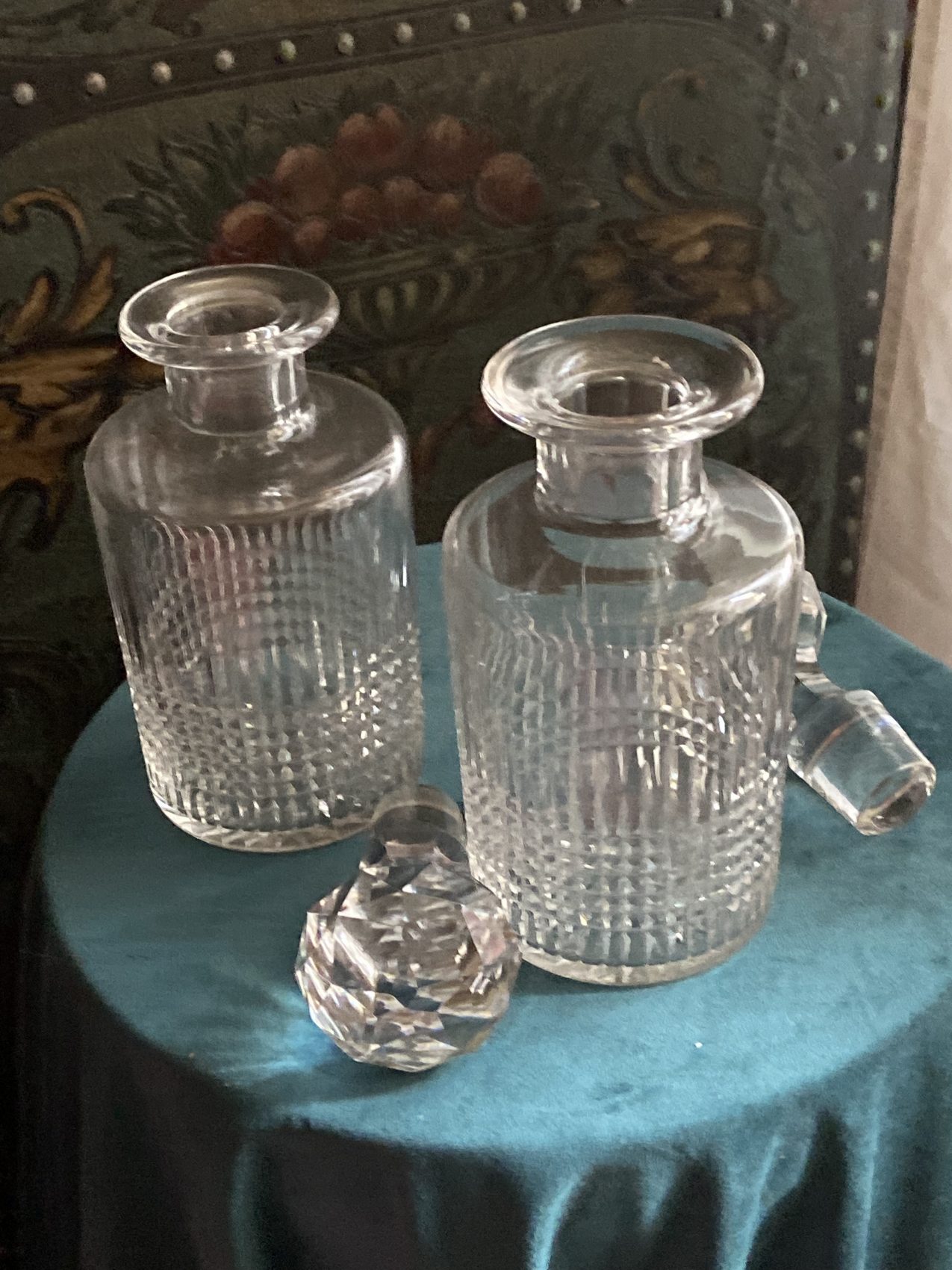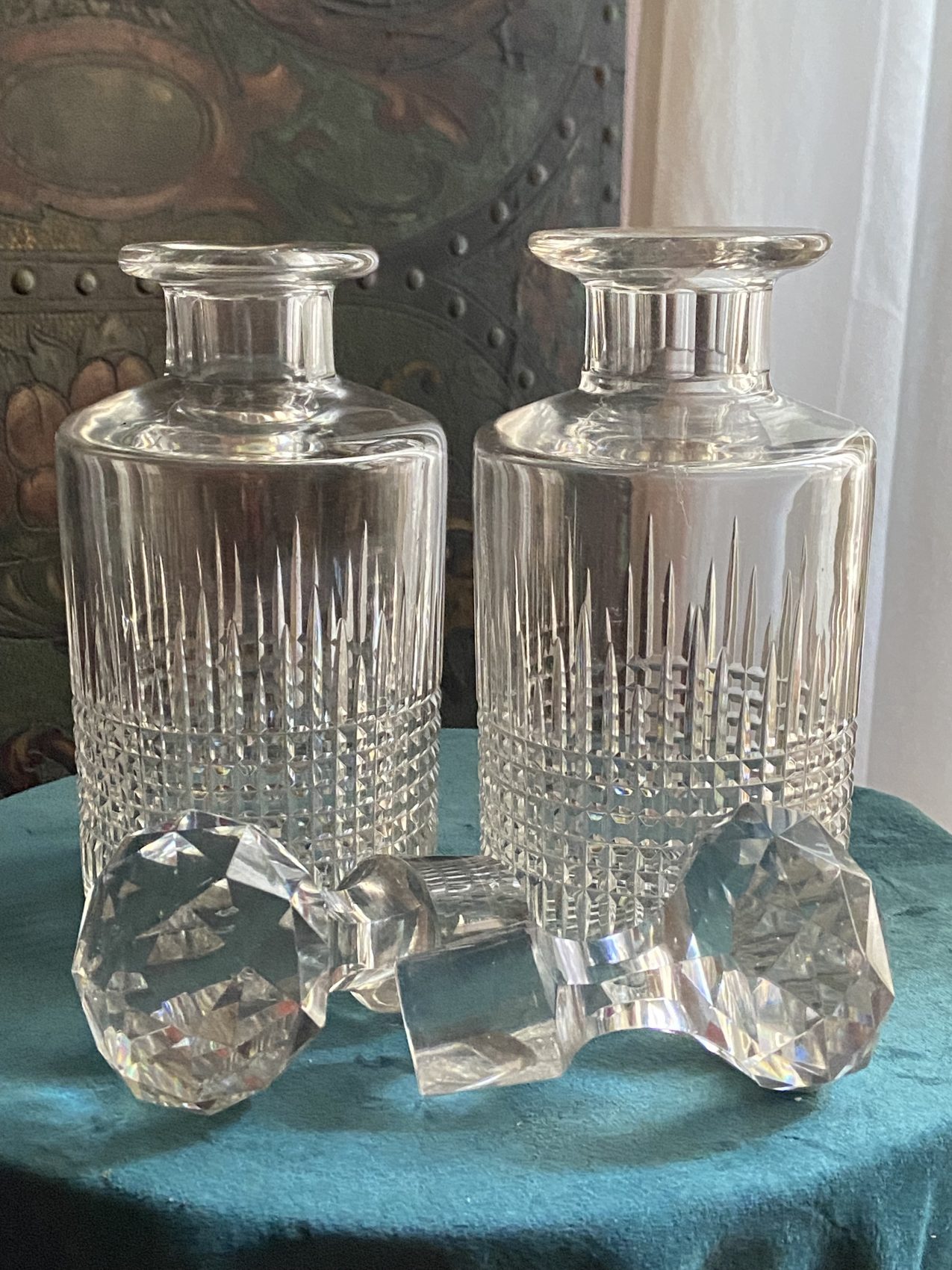 Ces flacons sont en parfait état, avec leur bouchon d’origine taillé en facettes, et l’estampille Baccarat gravée au socle.