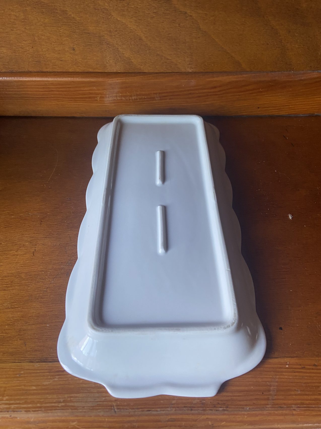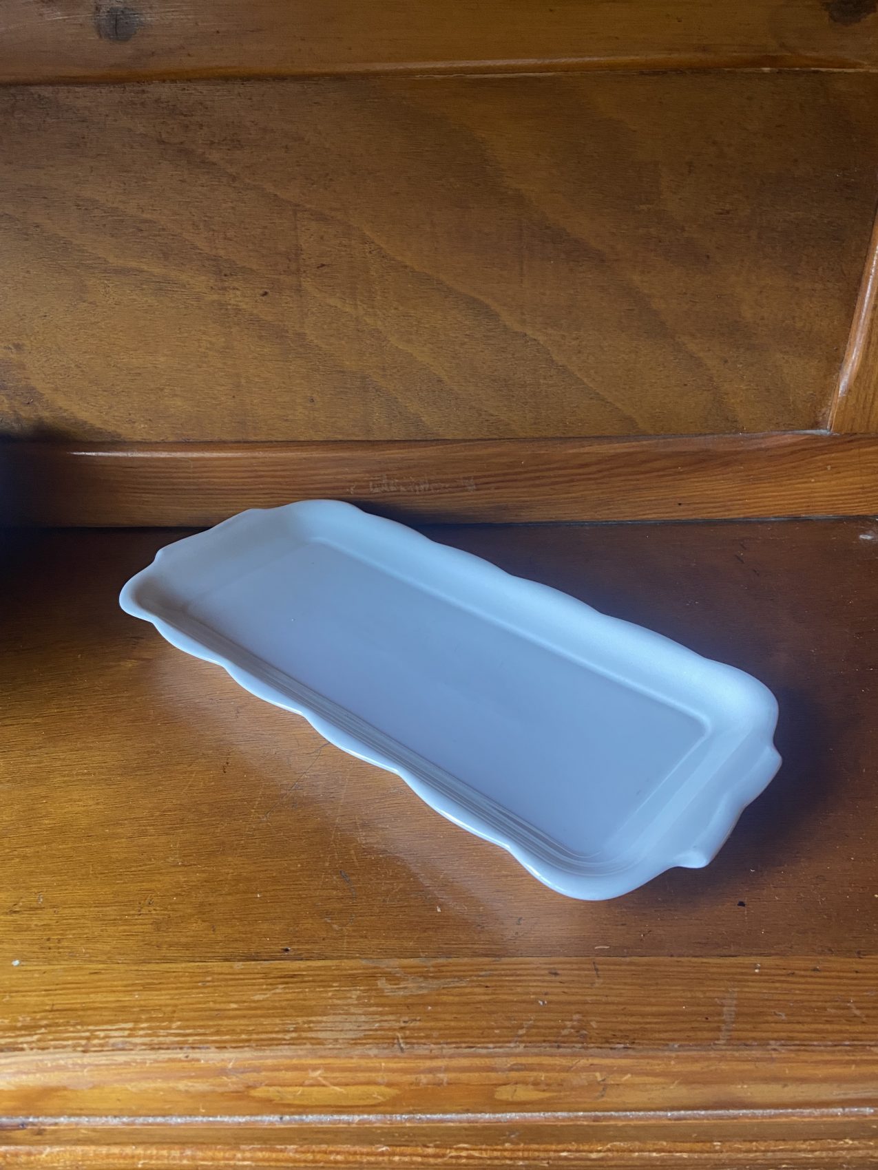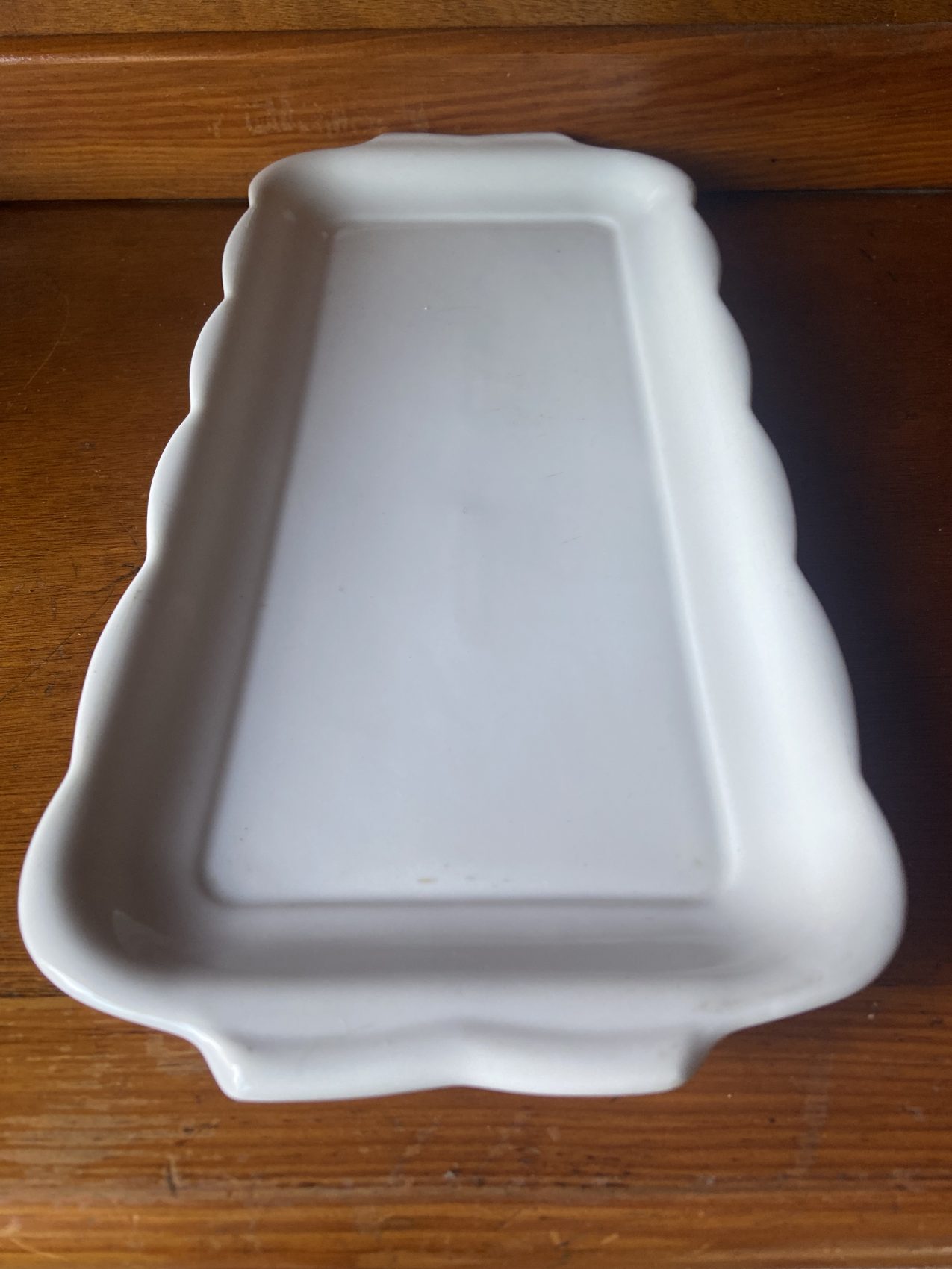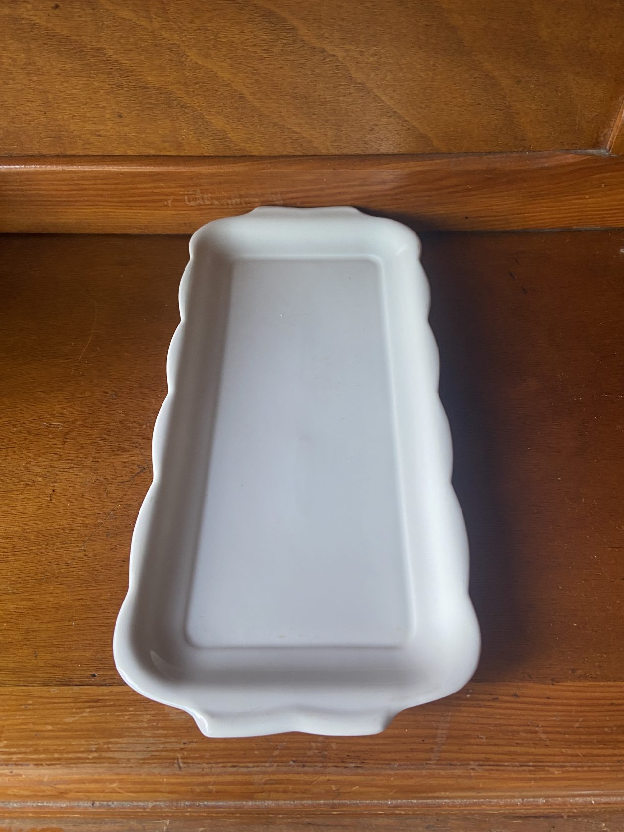 Ce plat à cake en faïence blanche, tout droit sorti des années 50, en fait partie.