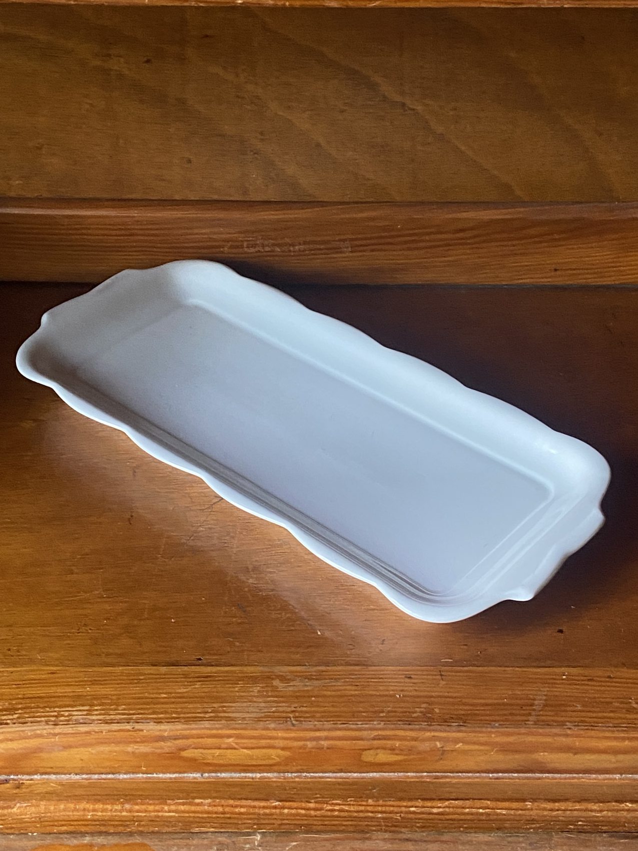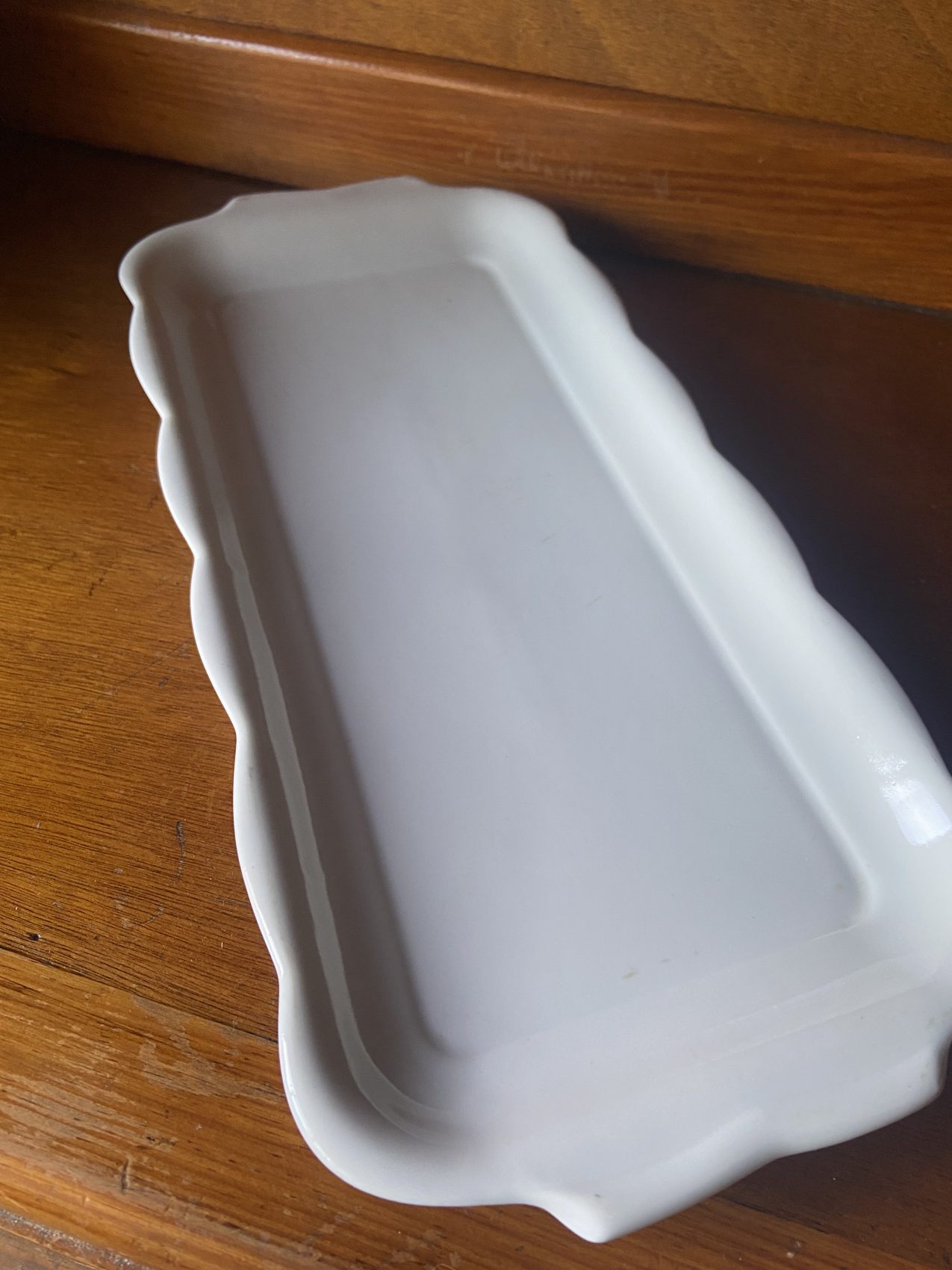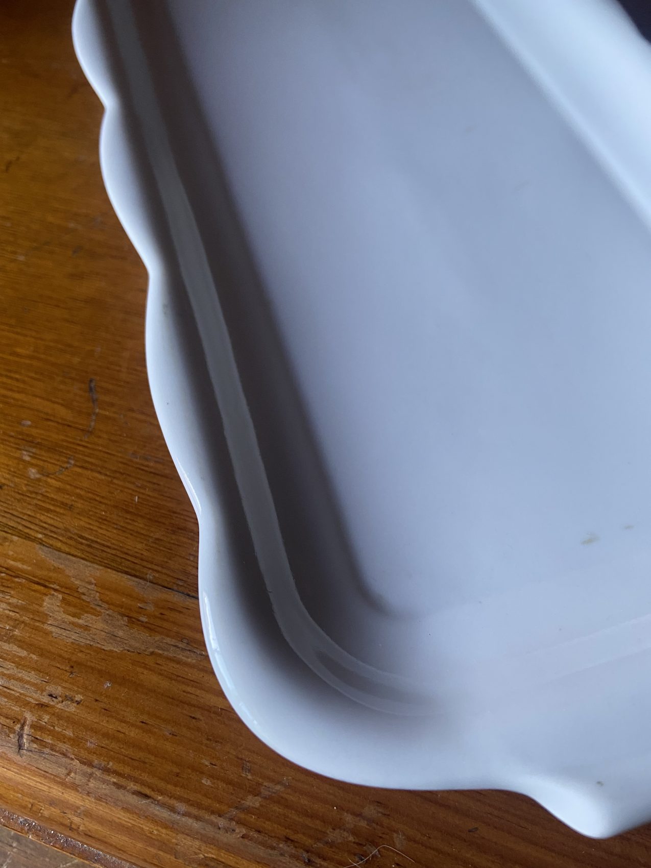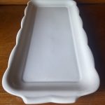 Ce plat à cake en faïence blanche, tout droit sorti des années 50, en fait partie.
