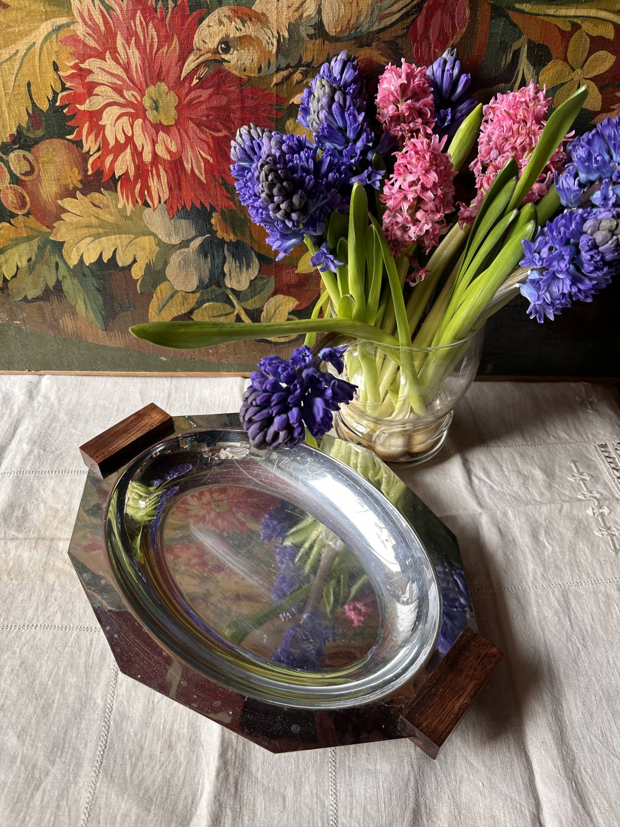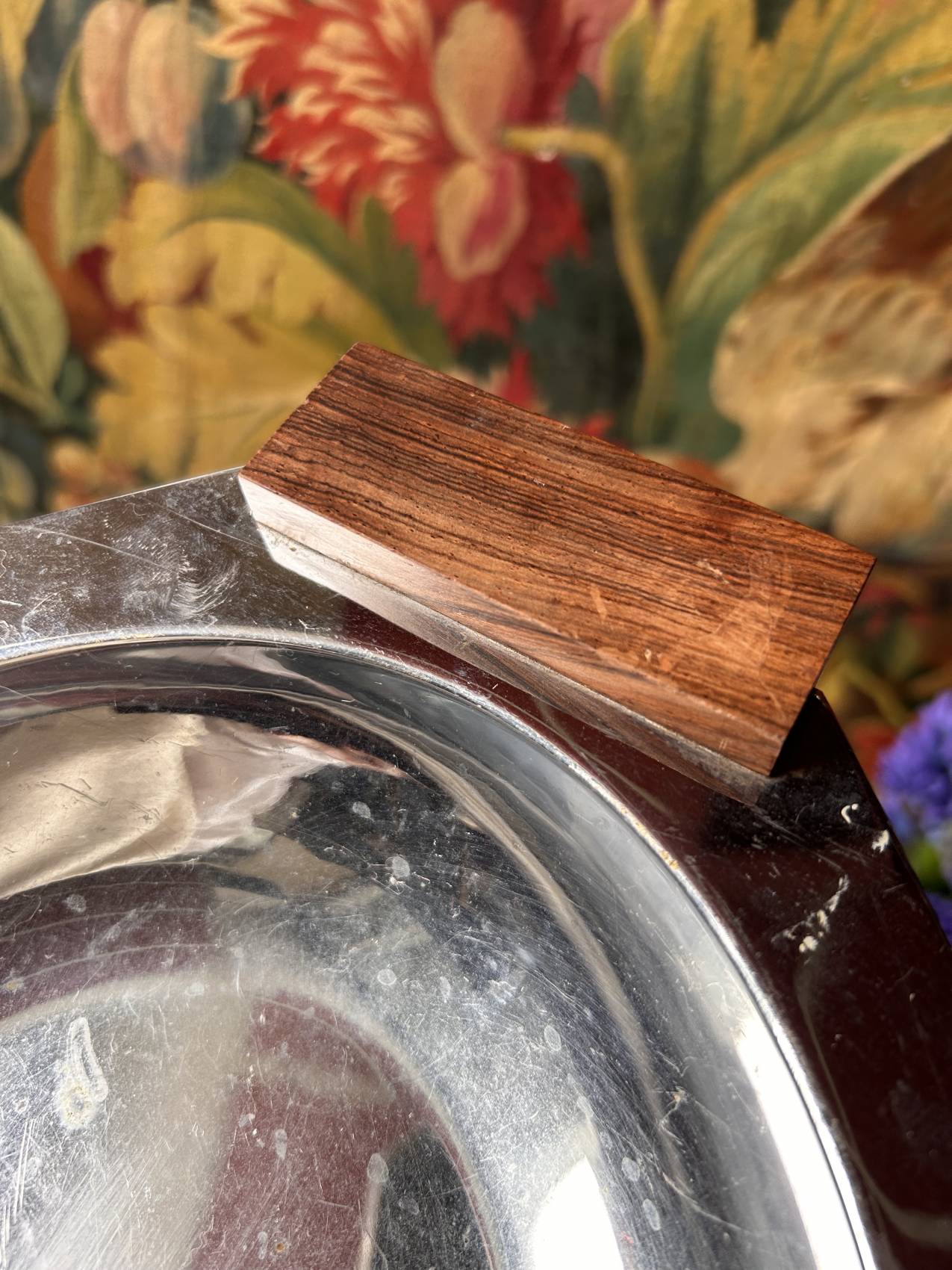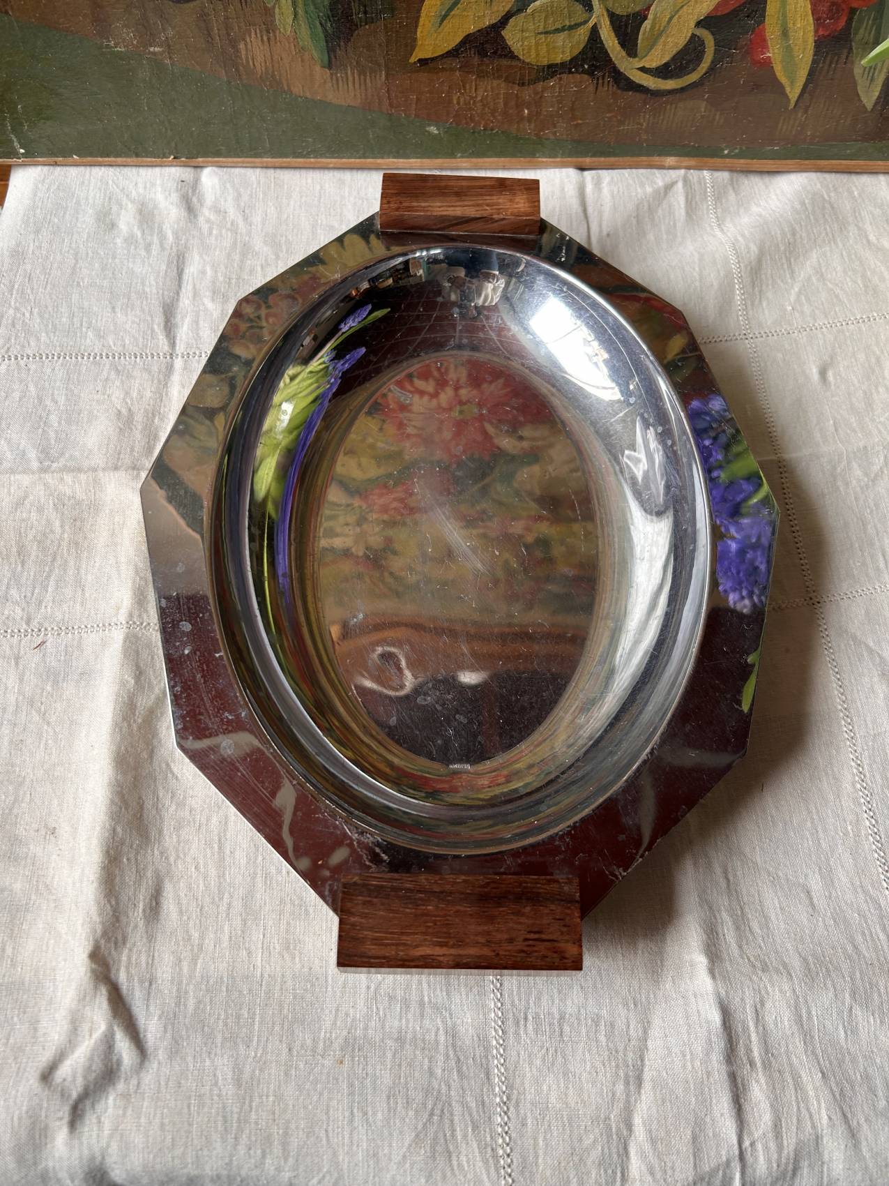 Un objet simple… mais avec beaucoup d’allure. Ce plat de service d’époque art déco associe la sobriété de l’inox à la chaleur du bois d’ébène. Une alliance typique des années 1920-1930 où le design privilégiait les lignes pures et les matières élégantes.