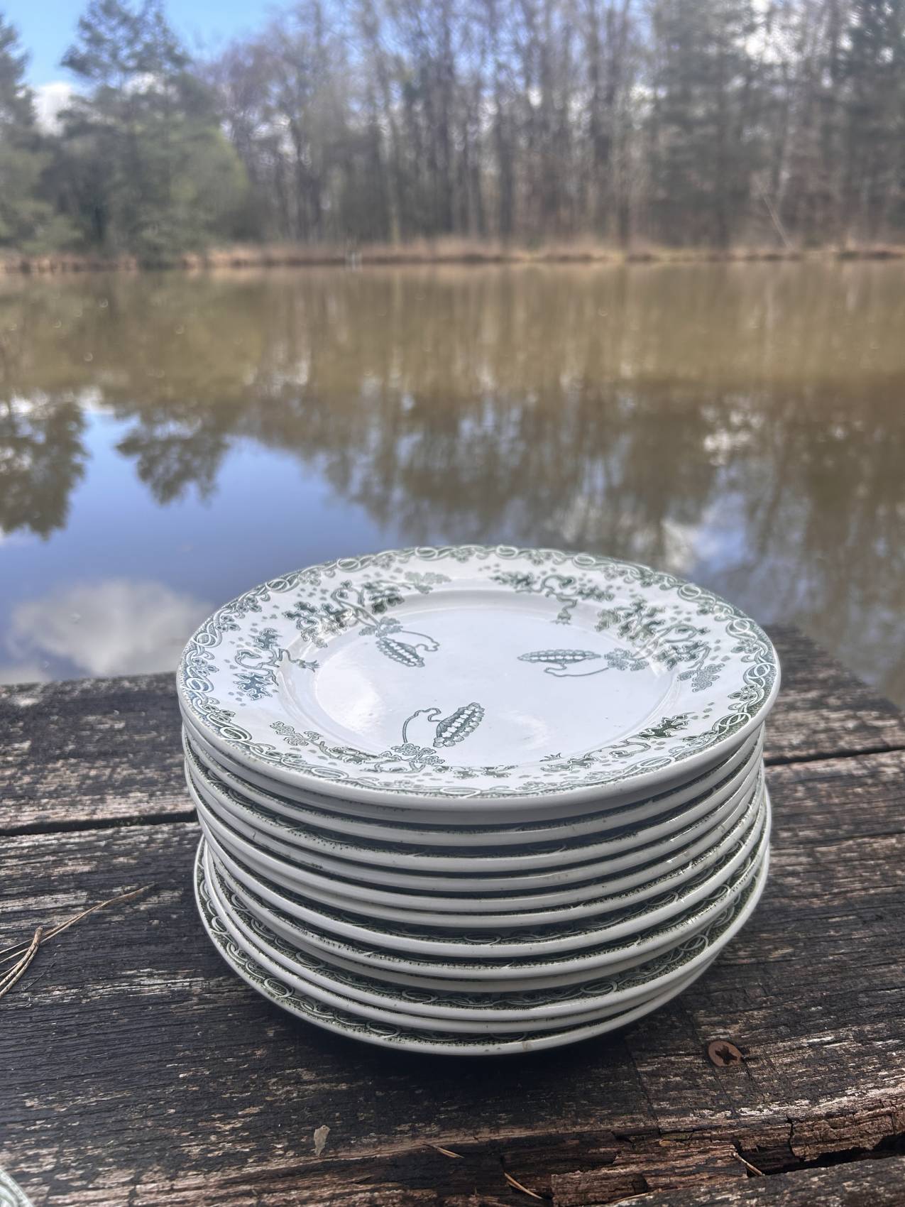 Lot de 12 assiettes plates anciennes Saint-Amand – modèle Moderne Style – décor vert – 23 cm