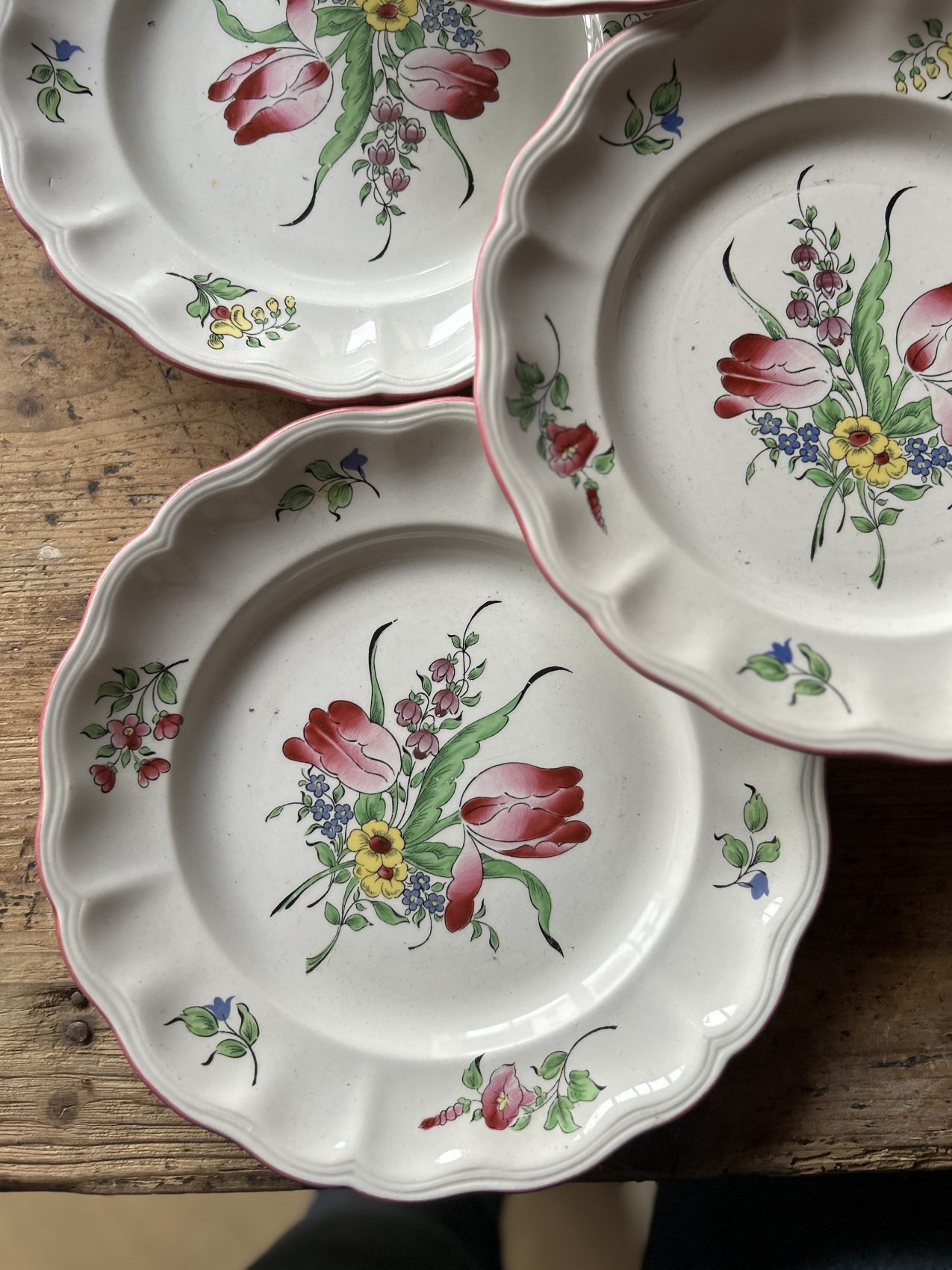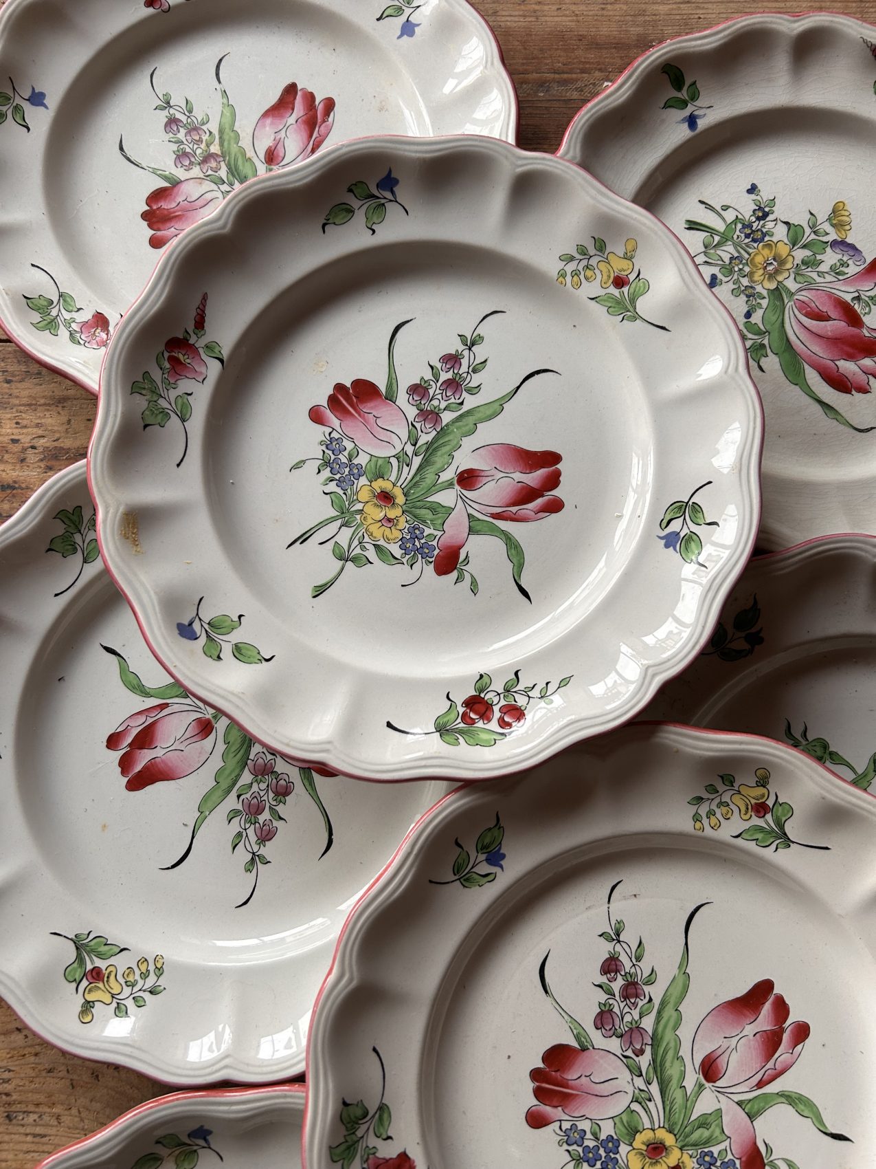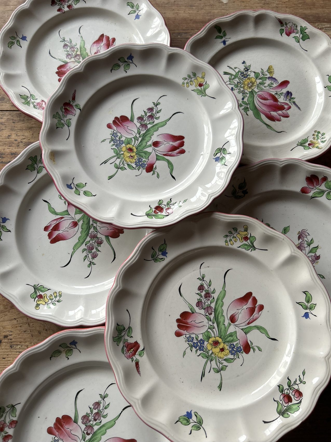 Série élégante de 7 assiettes plates KG Lunéville, début XXe, aux bords chantournés et au décor floral peint. C’est un ensemble particulièrement raffiné, esthétique, très représentatif du charme champêtre de la faïence française de cette époque. Les assiettes sont en bel état : pas de fêle, pas de manque, pas de patine excessive.