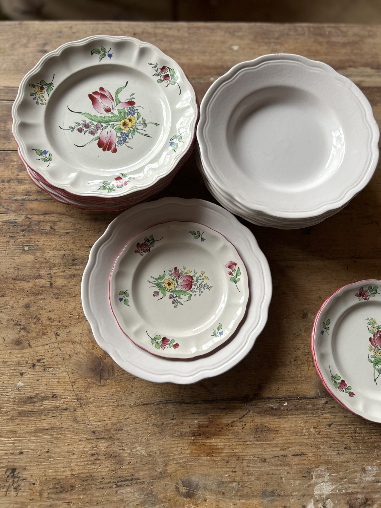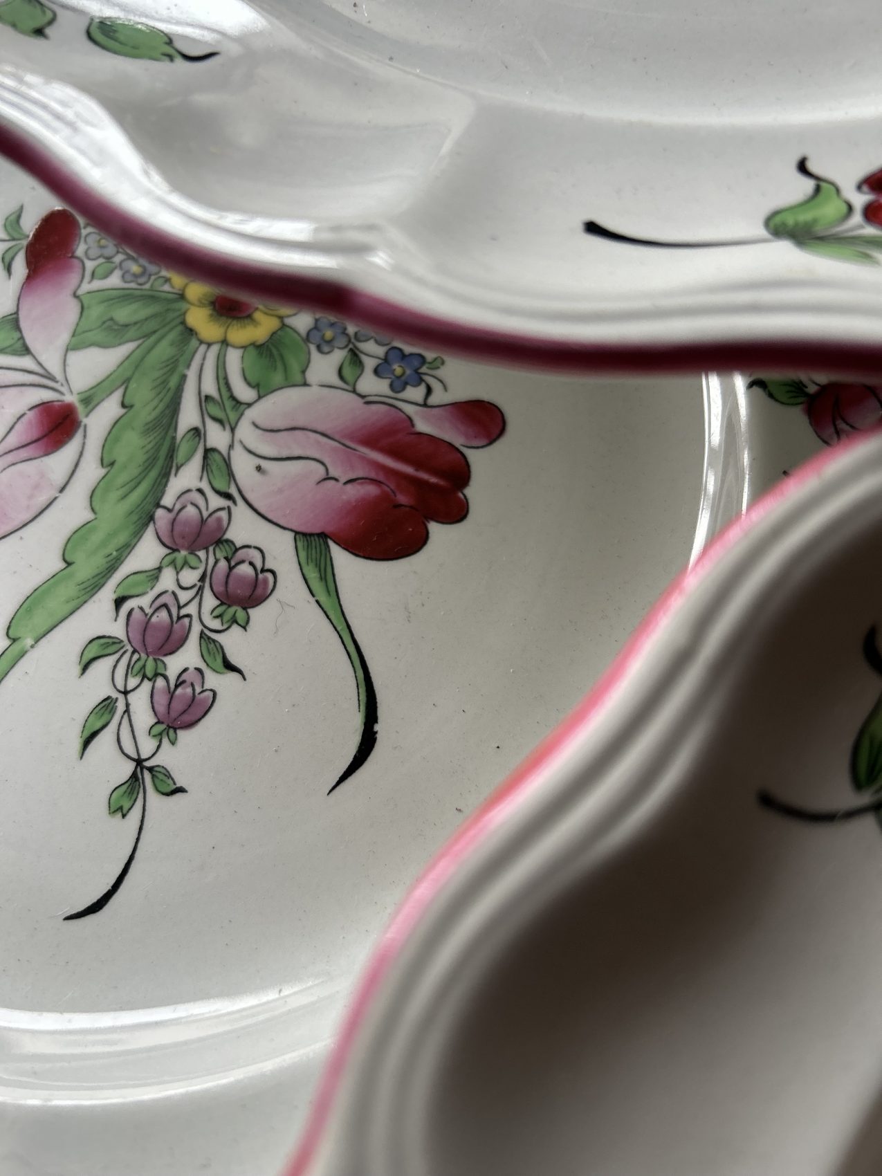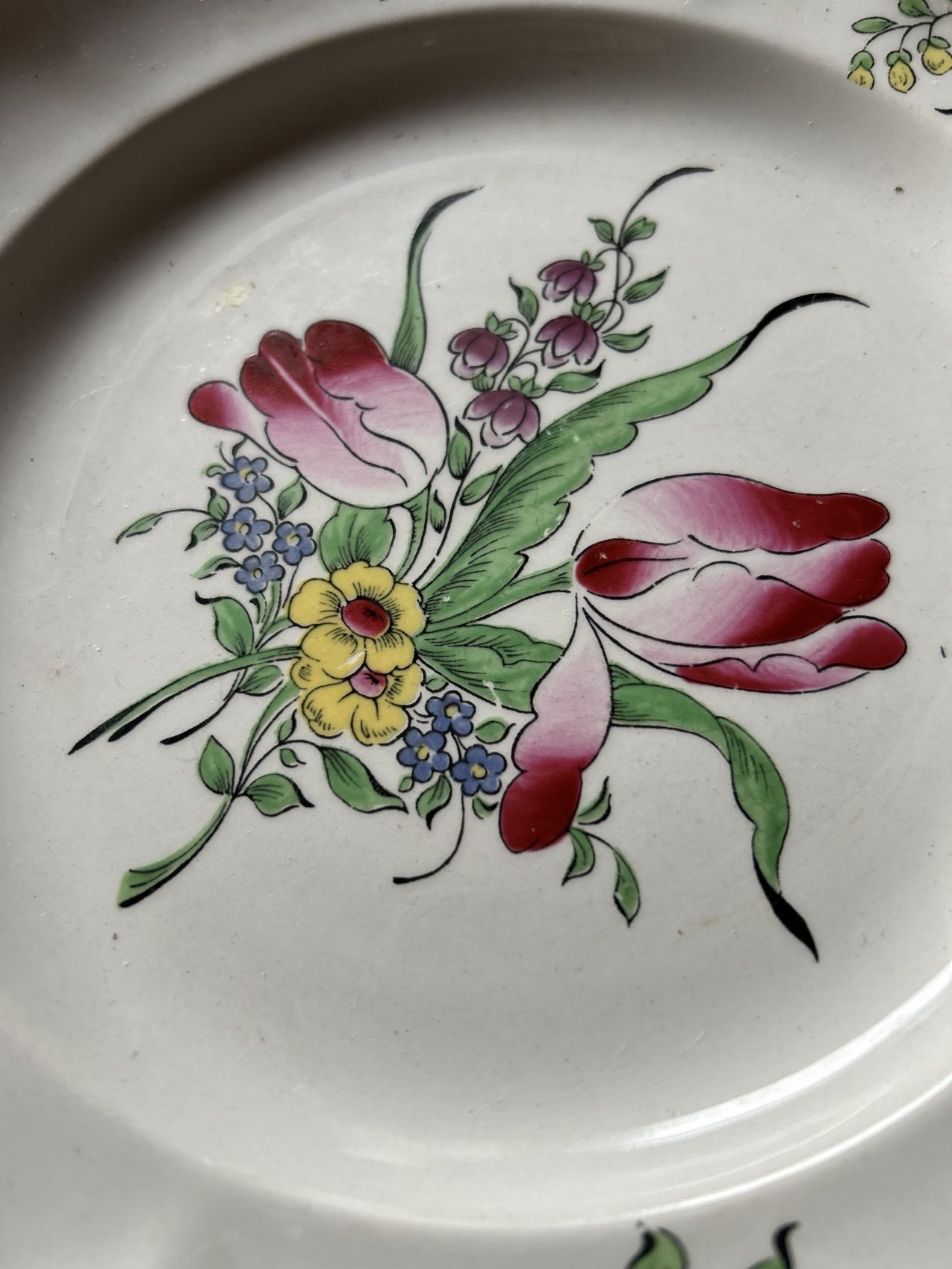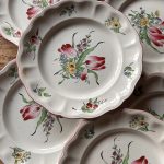 Série élégante de 7 assiettes plates KG Lunéville, début XXe, aux bords chantournés et au décor floral peint. C’est un ensemble particulièrement raffiné, esthétique, très représentatif du charme champêtre de la faïence française de cette époque. Les assiettes sont en bel état : pas de fêle, pas de manque, pas de patine excessive.