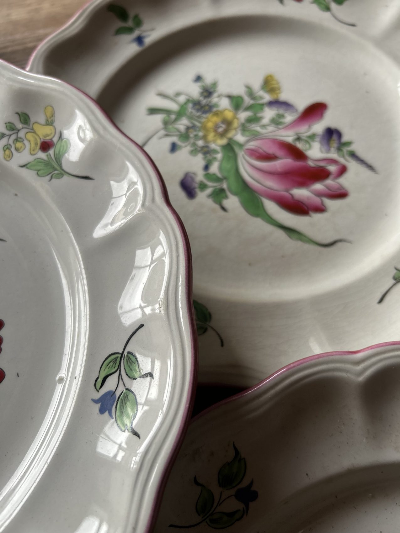 Série de 7 assiettes plates KG Lunéville – Début XXe – Motifs floraux peints
