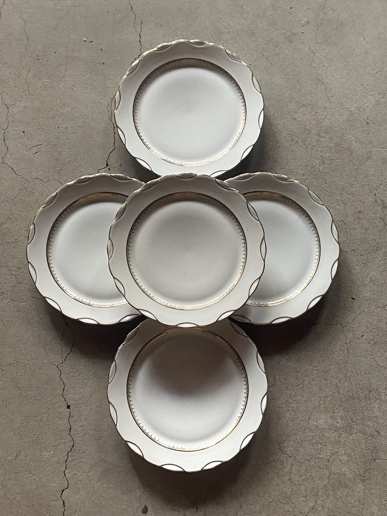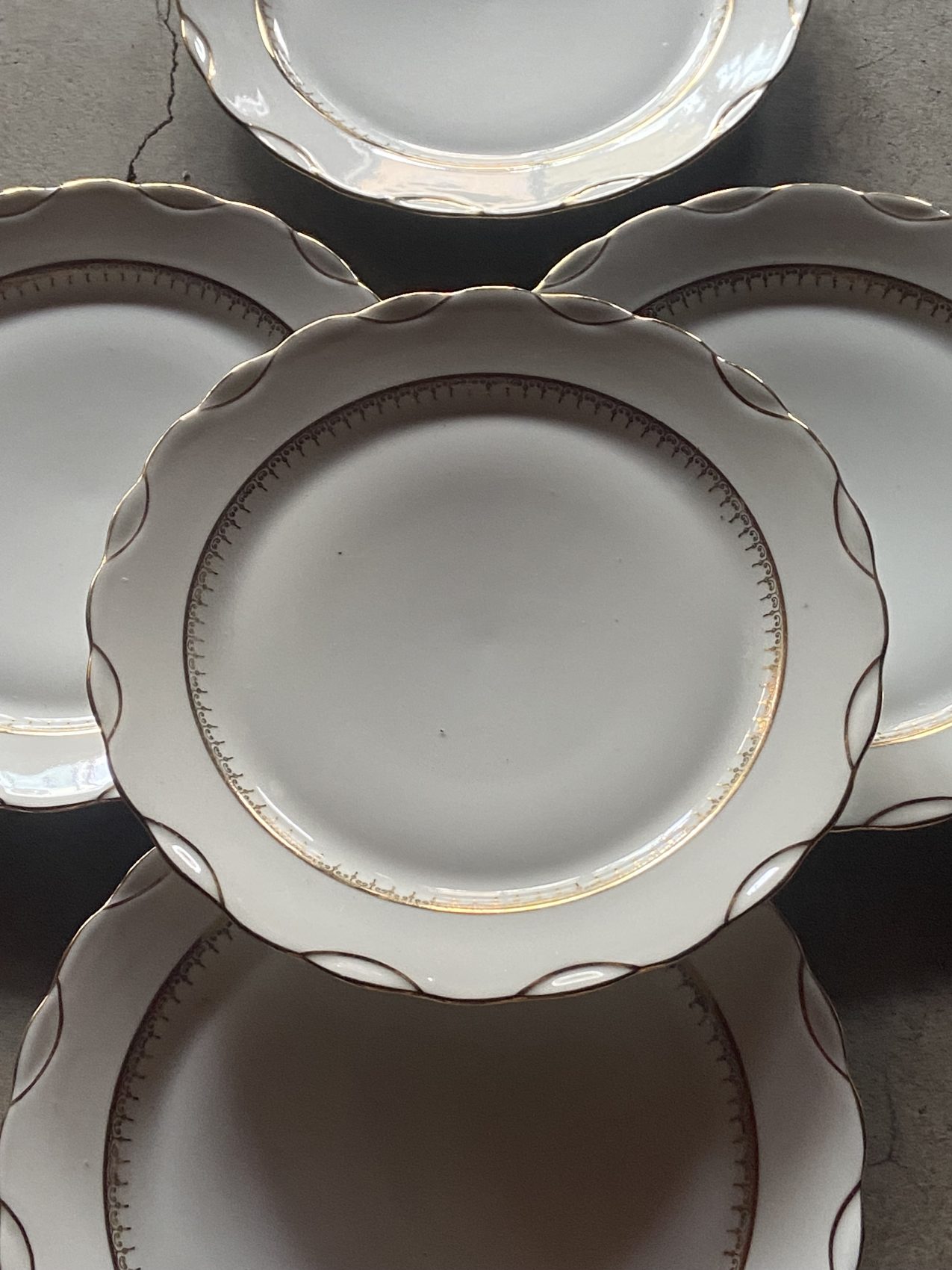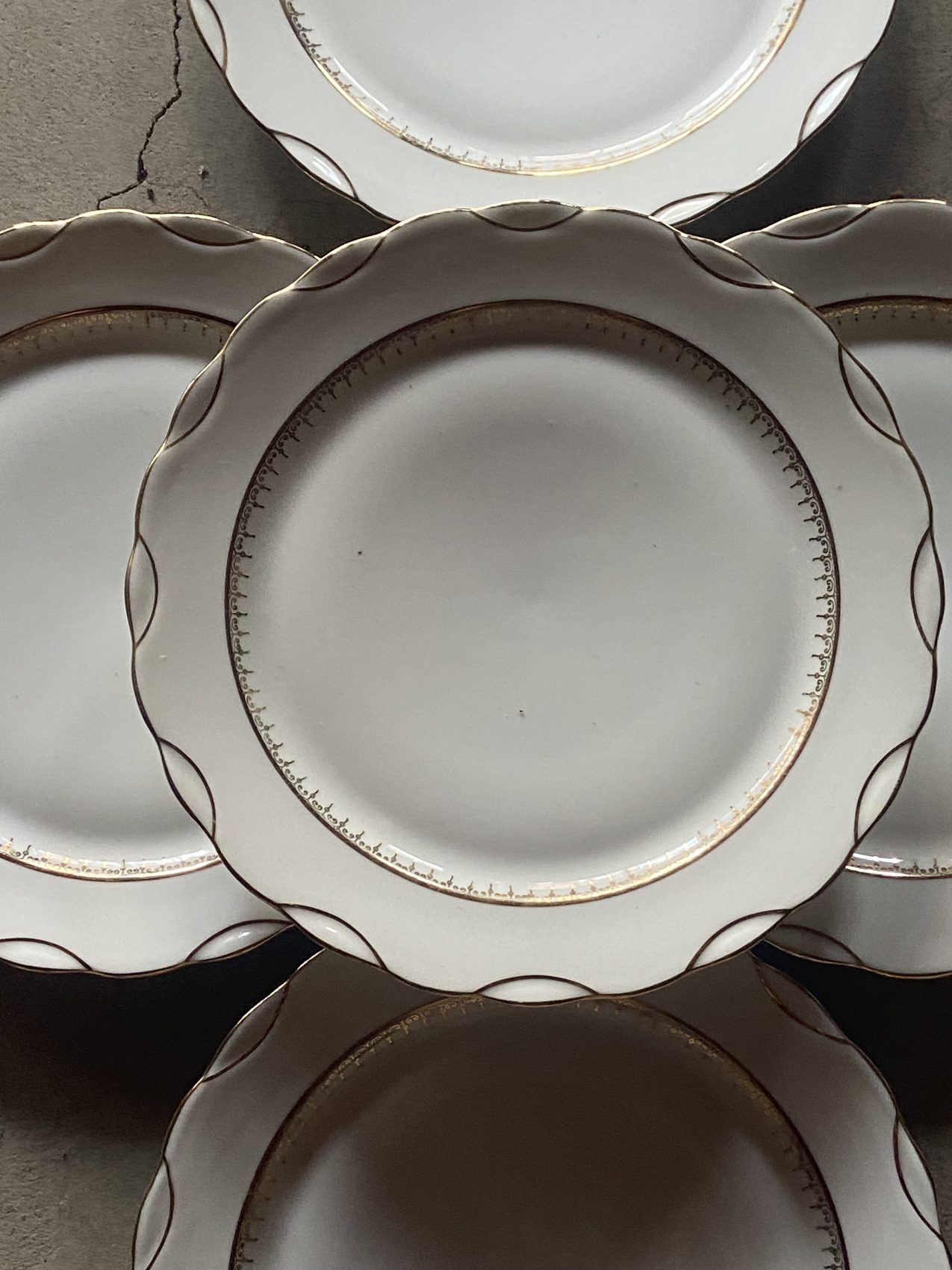 Série de cinq assiettes plates blanches bord or – Porcelaine ancienne du Berry à pâte de Limoges, années 60