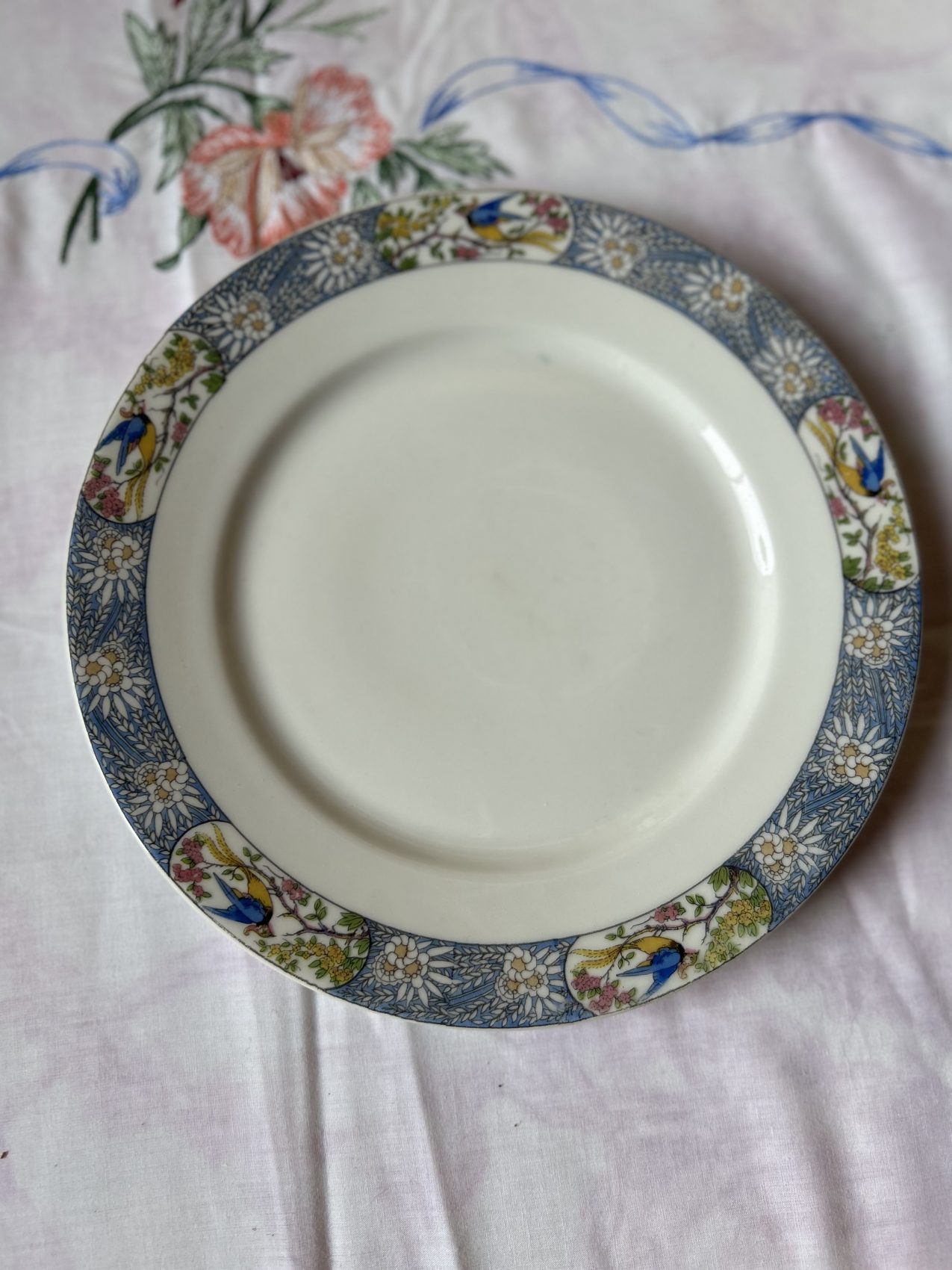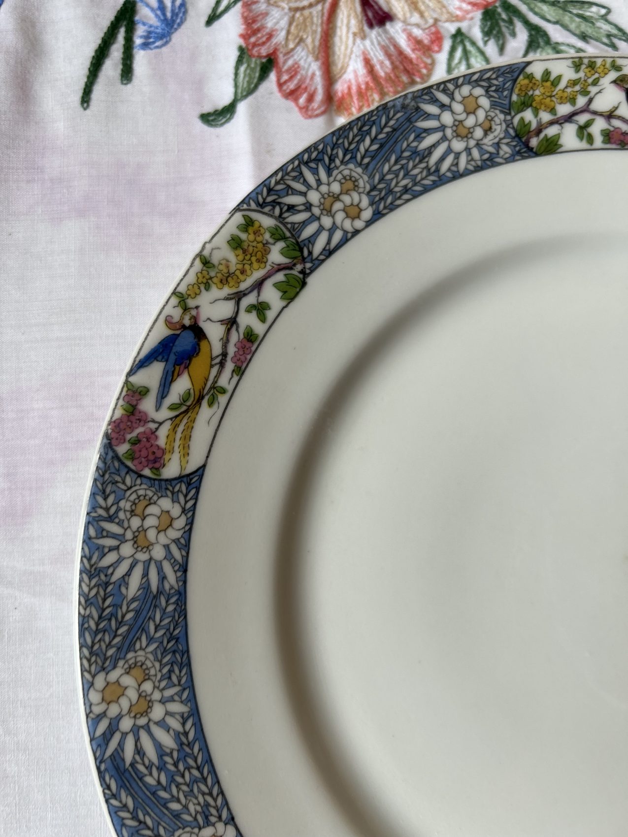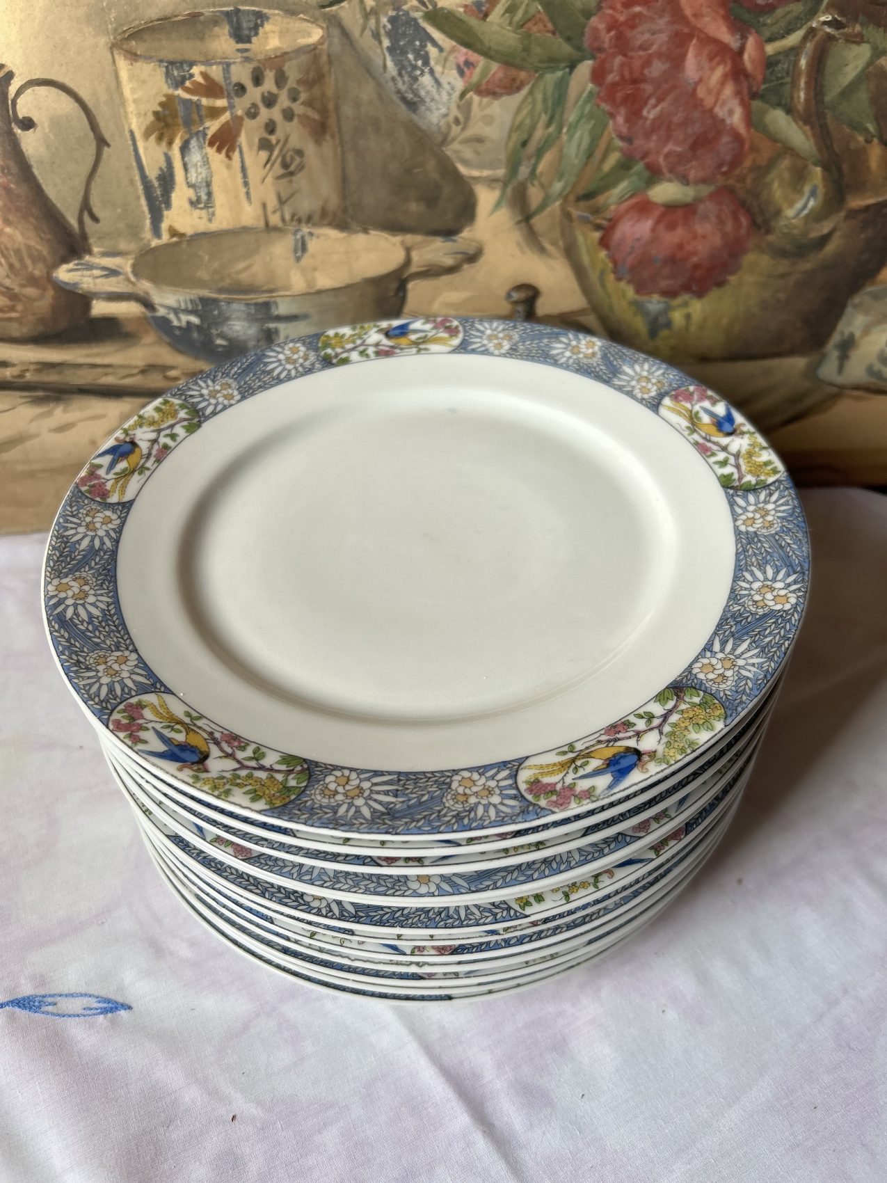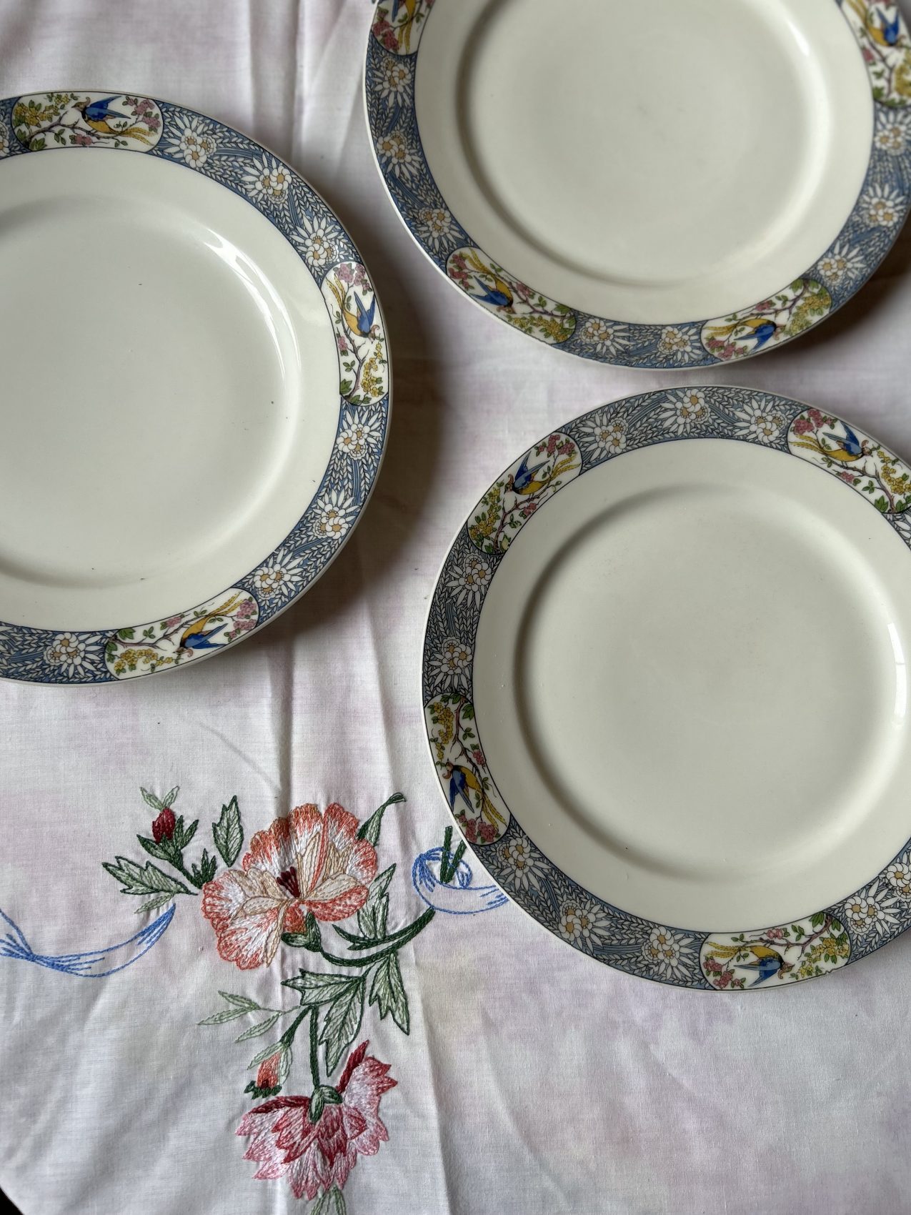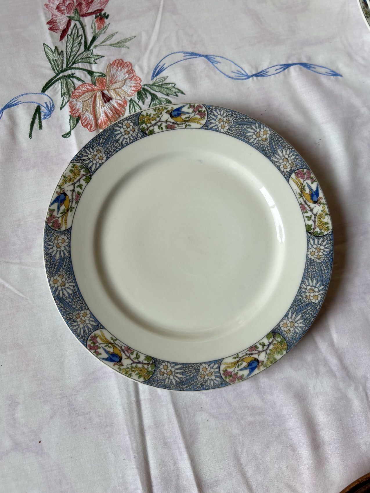 Il a ce charme un peu hors du temps que l’on ne retrouve plus aujourd’hui. Les oiseaux apportent une vraie personnalité, sans jamais voler la vedette au reste de la table. C’est exactement le genre de vaisselle que l’on aime sortir pour les belles occasions, mais qui fonctionne aussi très bien au quotidien, surtout mélangée avec une série blanche.