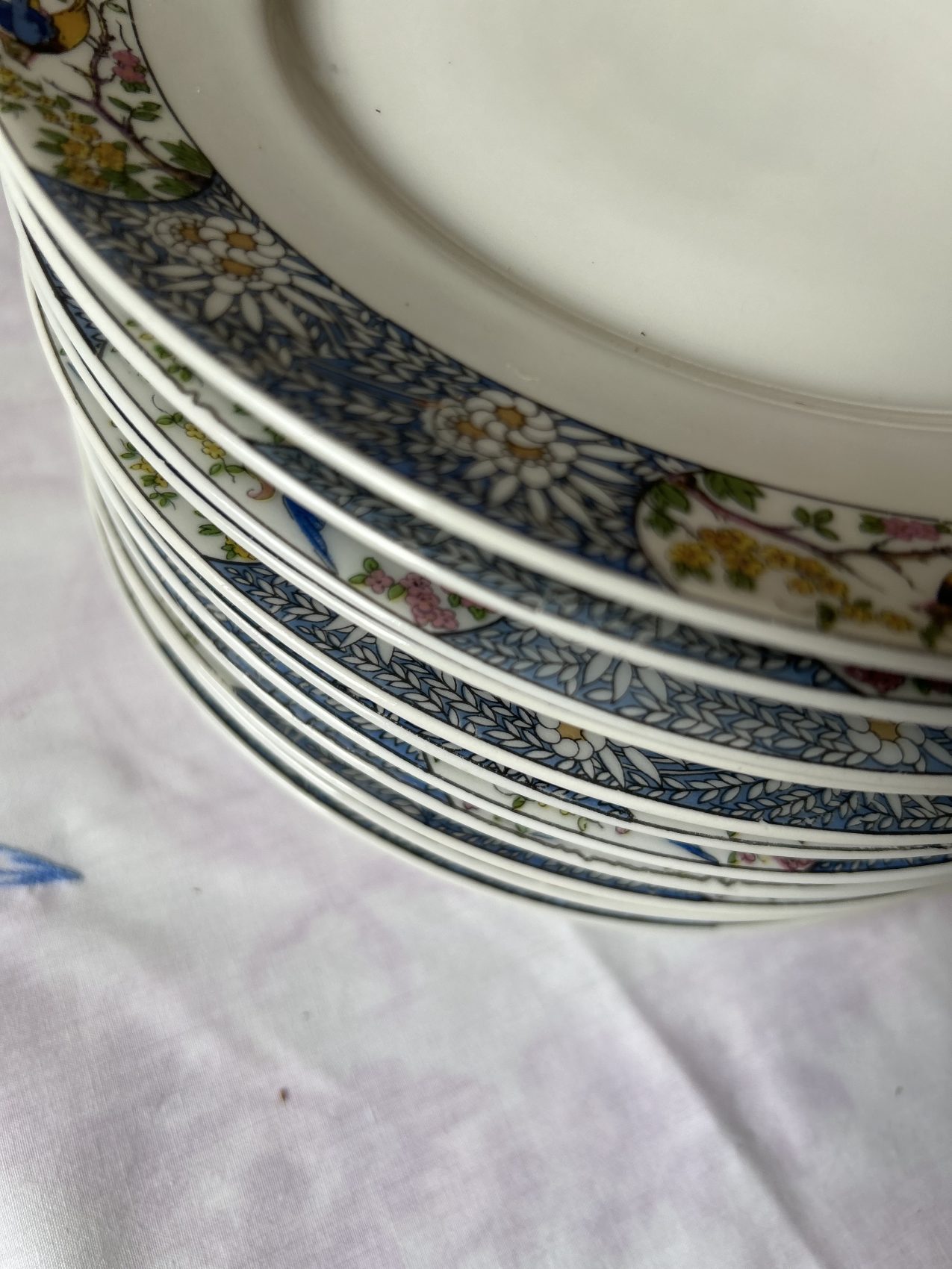 Le décor est une frise d’oiseaux de paradis. Élégante, atypique, parfaitement équilibrée. Ces oiseaux semblent presque prêts à s’envoler, posés là pour accompagner les repas avec une certaine poésie. Le modèle est original sans être exubérant, ce qui le rend étonnamment facile à associer, notamment avec une vaisselle blanche plus sobre.