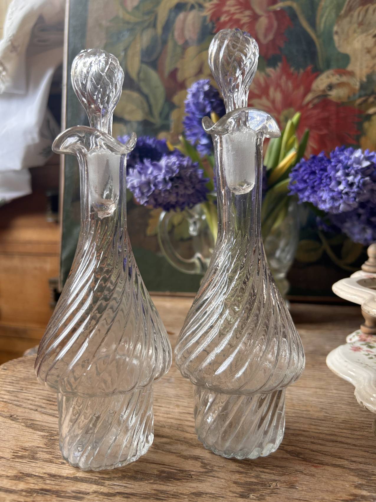 Les flacons en verre moulé apportent beaucoup de charme avec leurs bouchons anciens. Une pièce en verre ne fait pas partie de la même série que les autres, mais l’ensemble reste parfaitement fonctionnel et harmonieux.