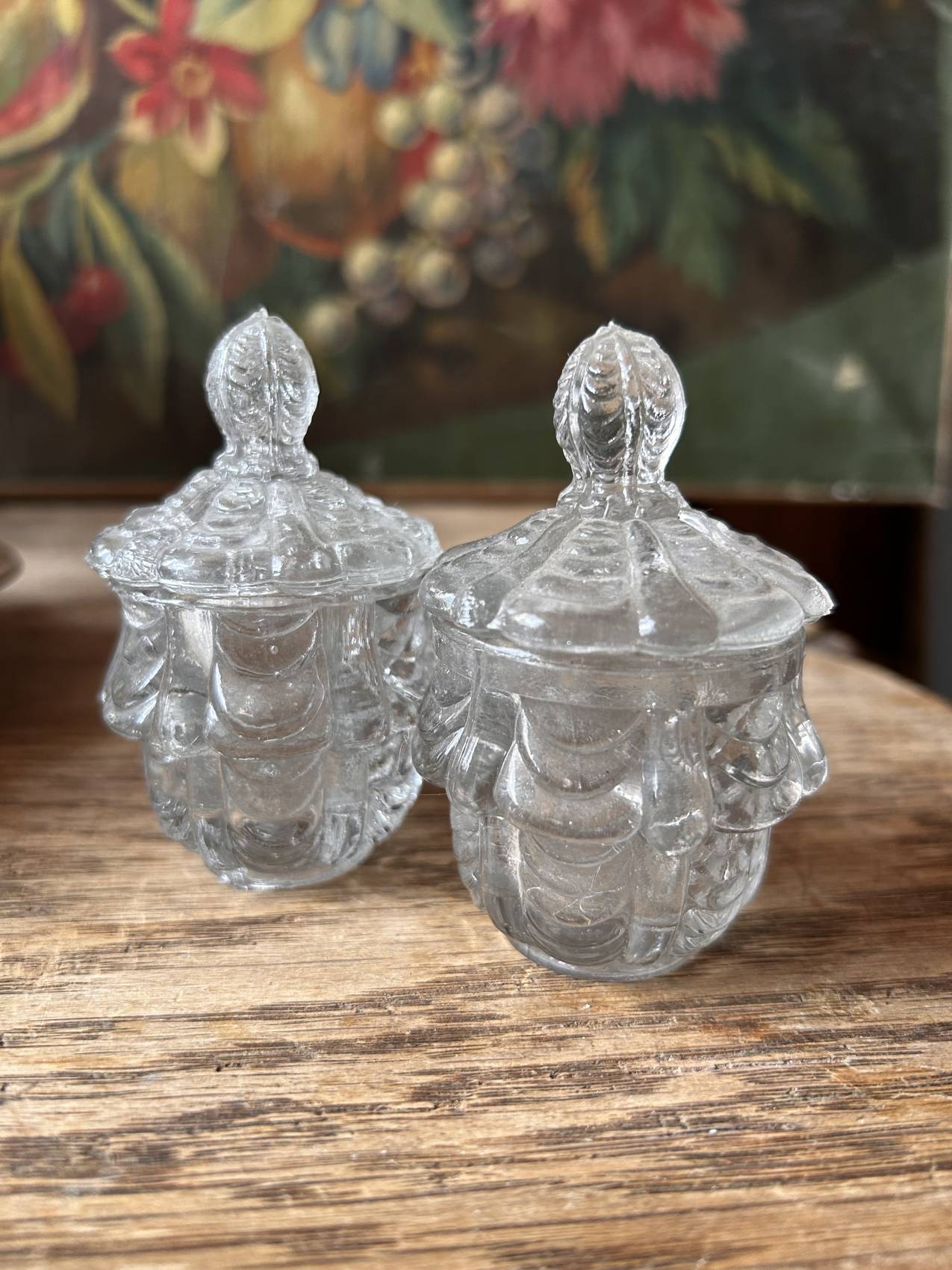 L’ensemble est ancien et cohérent. Un des flacons en verre provient d’une série différente, mais il s’intègre parfaitement et remplit sa fonction.