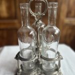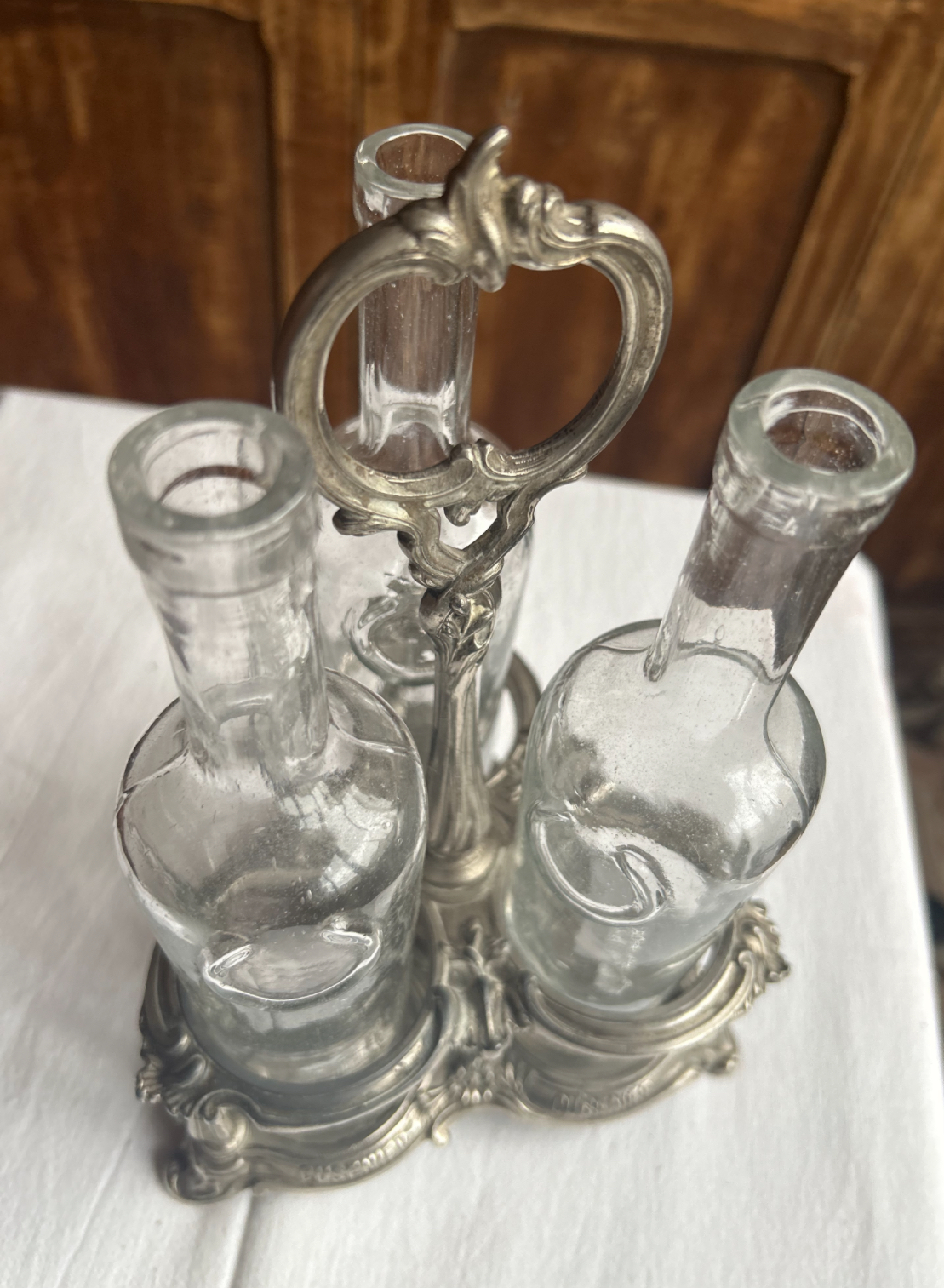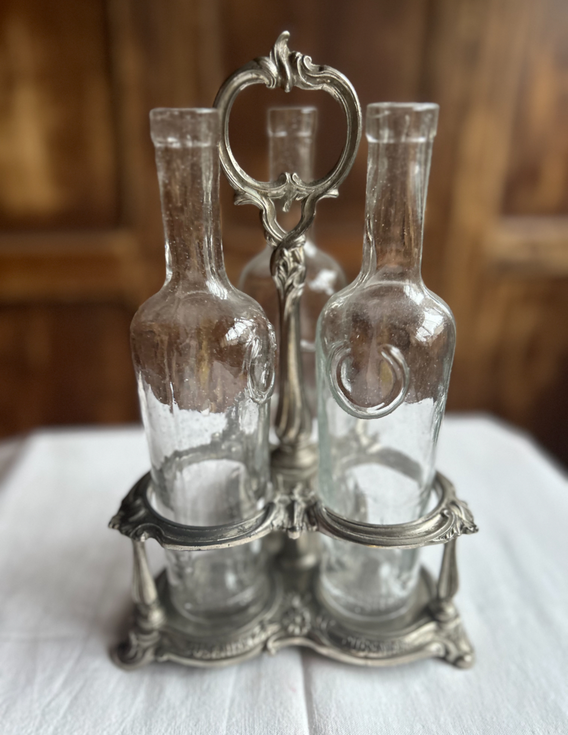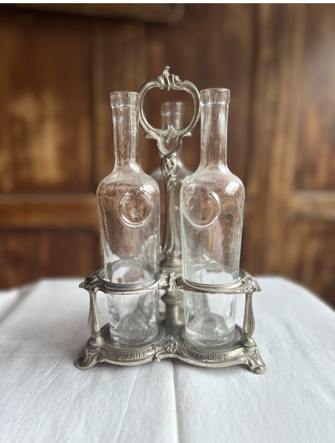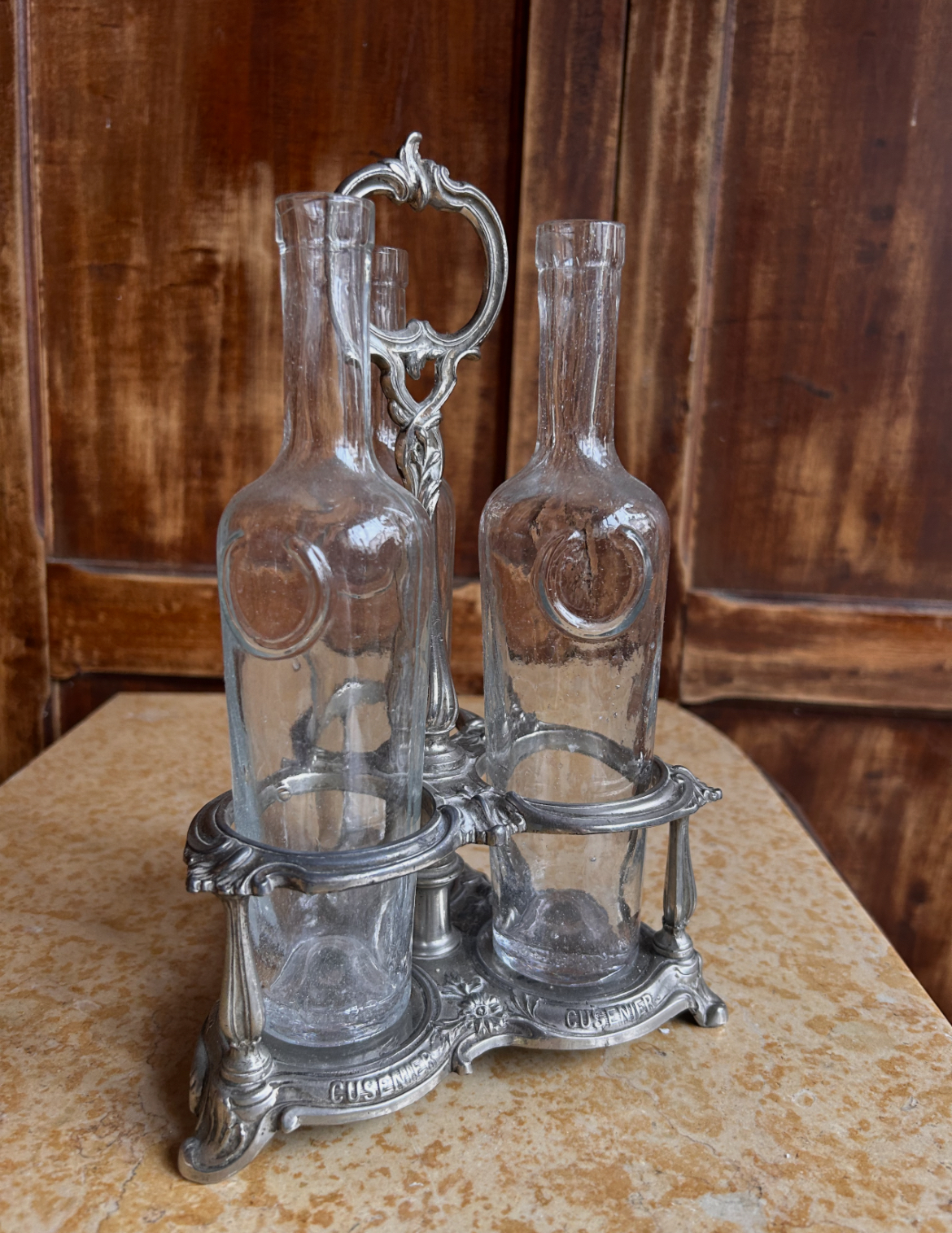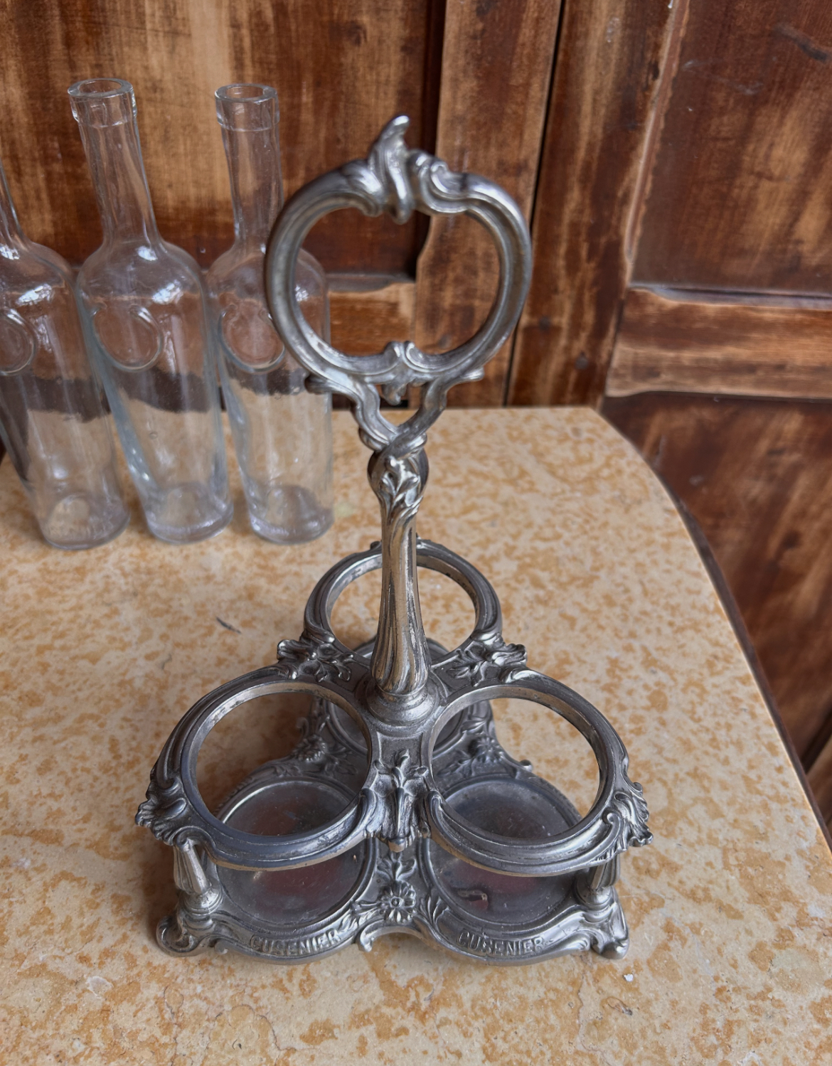 Ce serviteur à liqueur Cusenier, daté autour de 1900, est un véritable témoin de l’âge d’or des cafés et des comptoirs français en fonte d’aluminium, avec ses bouteilles artisanales d’origine, il incarne toute une époque.