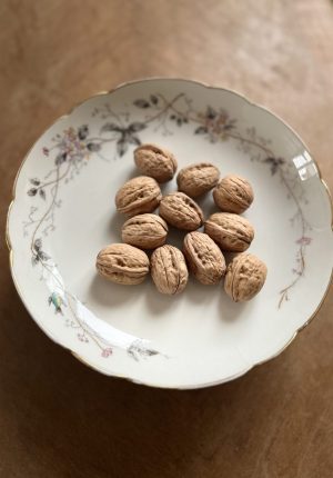 Compotier sur pied en porcelaine époque 1900 – Motifs d’aubépine et liseré or