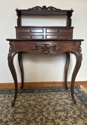 Meuble Bonheur du jour ancien en acajou flammé – Époque Napoléon III, style Louis XV