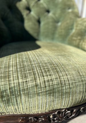 Fauteuil crapaud ancien capitonné velours vert anglais patiné et acajou