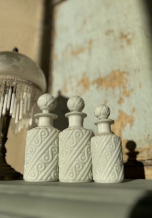 Trio de flacons de toilette anciens en opaline blanche