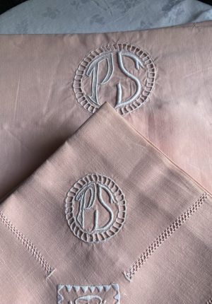 Grande nappe ancienne 2 x 3 en lin rose brodé – Monogramme PS – 12 serviettes assorties