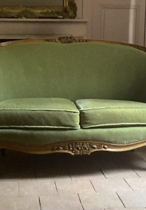 Petit canapé Corbeille Louis XV en velours vert amande – rénovation tapissier