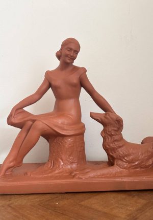Grande Sculpture art déco ancienne “L’amitié” Femme au chien lévrier