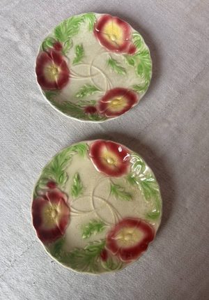 Duo d’assiettes plates en faïence barbotine aux anémones – Époque 1900 – Attribuées à Onnaing