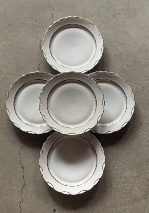Série de cinq assiettes plates blanches bord or – Porcelaine ancienne du Berry à pâte de Limoges, années 60
